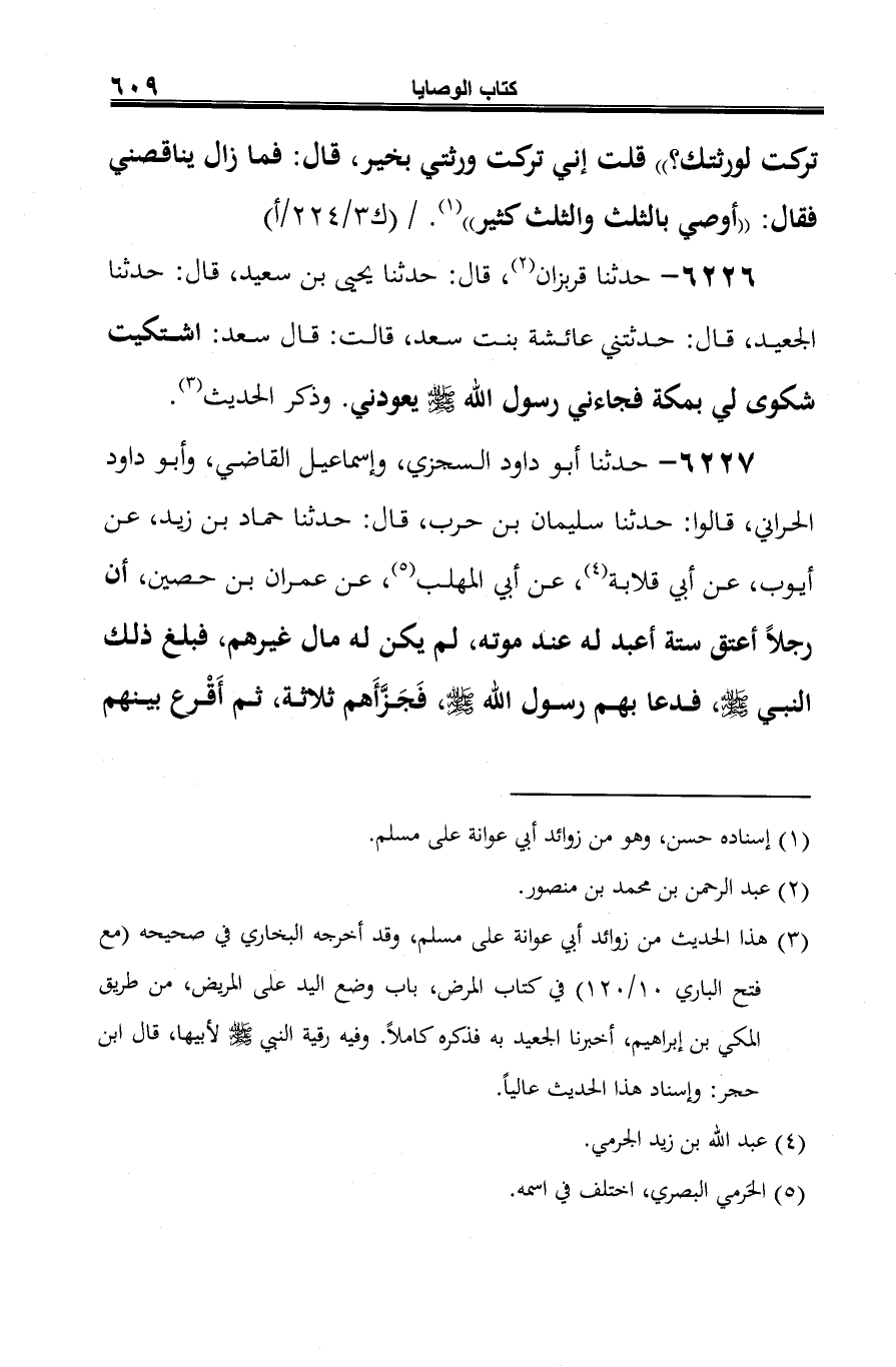 6227 - حدثنا أبو داود السجزي، وإسماعيل القاضي، وأبو داود الحراني، قالوا: حدثنا سليمان بن حرب، قال: حدثنا حماد بن زيد، عن أيوب، عن أبي قلابة (¬1)، عن أبي المهلب (¬2)، عن عمران بن حصين، أن رجلًا أعتق ستة أعبد له عند موته، لم يكن له مال غيرهم، فبلغ ذلك النبي -صلى الله عليه وسلم-، فدعا بهم رسول الله صلى الله عليه وسلم، فَجَزَّأَهم ثلاثة، ثم أَقْرع بينهم