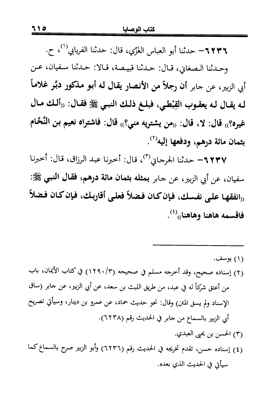 وحدثنا الصغاني، قال: حدثنا قبيصة، قالا: حدثنا سفيان، عن أبي الزبير، عن جابر أن رجلًا من الأنصار يقال له أبو مذكور دبَّر غلامًا له يقال له يعقوب القِبْطي، فبلغ ذلك النبي صلى الله عليه وسلم فقال: "ألك مال غيره؟ " قال: لا، قال: "من يشتريه مني؟ " قال: فاشتراه نعيم بن النَّحَّام بثمان مائة درهم، ودفعها إليه (¬2).