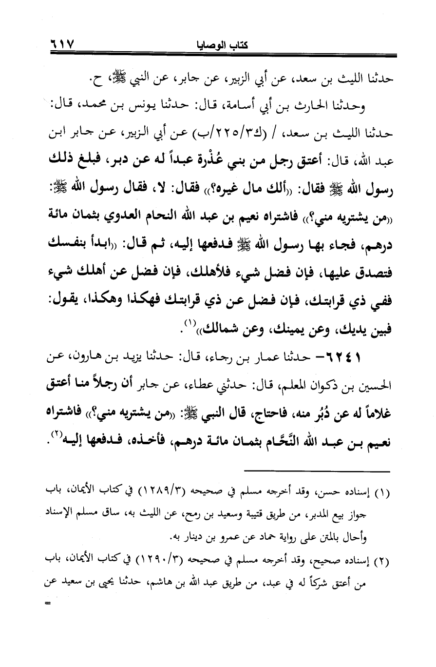 6241 - حدثنا عمار بن رجاء، قال: حدثنا يزيد بن هارون، عن الحسين بن ذكوان المعلم، قال: حدثني عطاء، عن جابر أن رجلًا منا أعتق غلامًا له عن دُبُر منه، فاحتاج، قال النبي صلى الله عليه وسلم: "من يشتريه مني؟ " فاشتراه نعيم بن عبد الله النَّحَّام بثمان مائة درهم، فأخذه، فدفعها إليه (¬1).