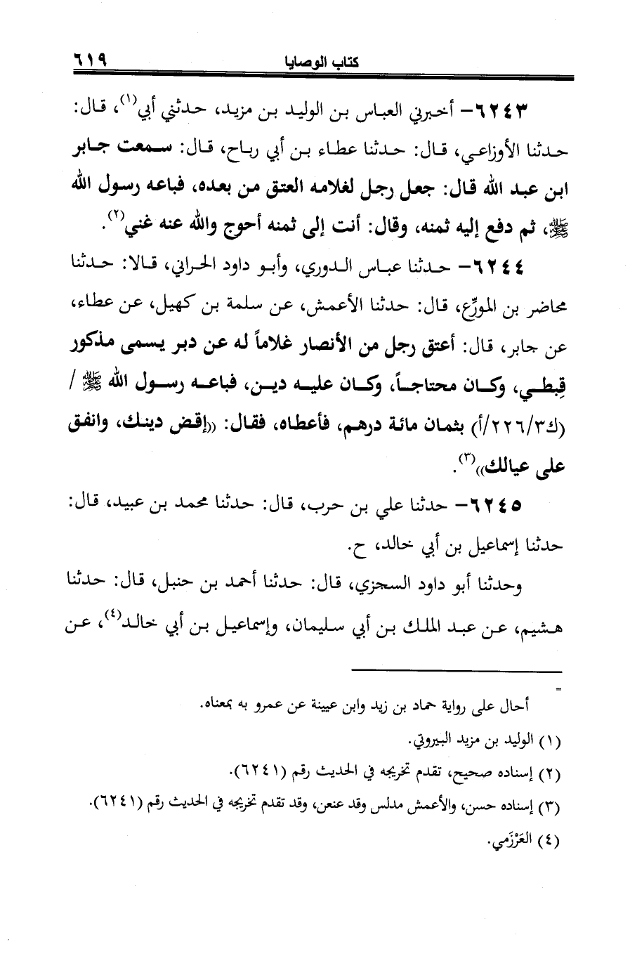 6243 - أخبرني العباس بن الوليد بن مزيد، حدثني أبي (¬1)، قال: حدثنا الأوزاعي، قال: حدثنا عطاء بن أبي رباح، قال: سمعت جابر ابن عبد الله قال: جعل رجل لغلامه العتق من بعده، فباعه رسول الله -صلى الله عليه وسلم-، ثم دفع إليه ثمنه، وقال: أنت إلى ثمنه أحوج والله عنه غني (¬2).