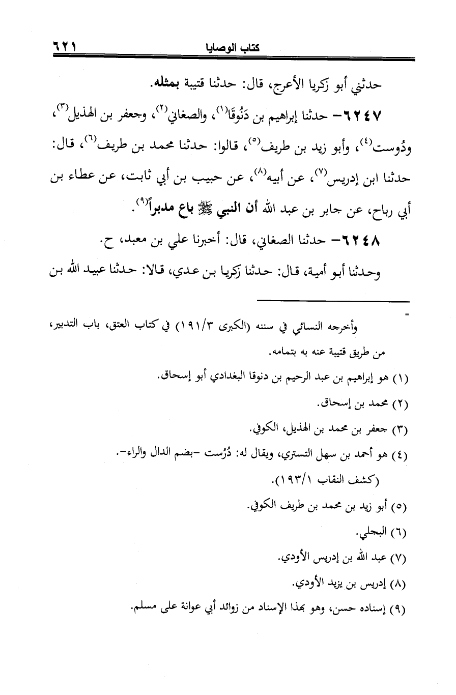 6247 - حدثنا إبراهيم بن دَنُوقَا (¬1)، والصغاني (¬2)، وجعفر بن الهذيل (¬3)، ودُوست (¬4)، وأبو زيد بن طريف (¬5)، قالوا: حدثنا محمد بن طريف (¬6)، قال: حدثنا ابن إدريس (¬7)، عن أبيه (¬8)، عن حبيب بن أبي ثابت، عن عطاء بن أبي رباح، عن جابر بن عبد الله أن النبي صلى الله عليه وسلم باع مدبرًا (¬9).