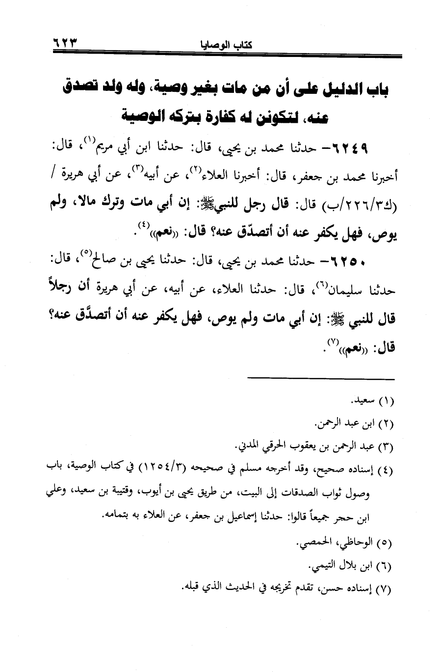 6250 - حدثنا محمد بن يحيى، قال: حدثنا يحيى بن صالح (¬1)، قال: حدثنا سليمان (¬2)، قال: حدثنا العلاء، عن أبيه، عن أبي هريرة أن رجلًا قال للنبي -صلى الله عليه وسلم-: إن أبي مات ولم يوص، فهل يكفر عنه أن أتصدَّق عنه؟ قال: "نعم" (¬3).