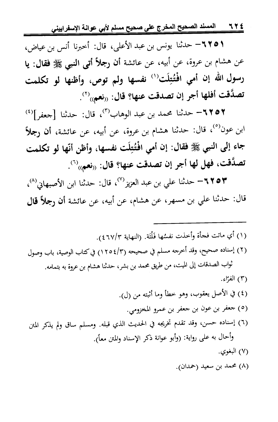 (¬2) إسناده صحيح، وقد أخرجه مسلم في صحيحه (3/ 1254) في كتاب الوصية، باب وصول ثواب الصدقات إلى الميت، من طريق محمد بن بشر، حدثنا هشام بن عروة به بتمامه.