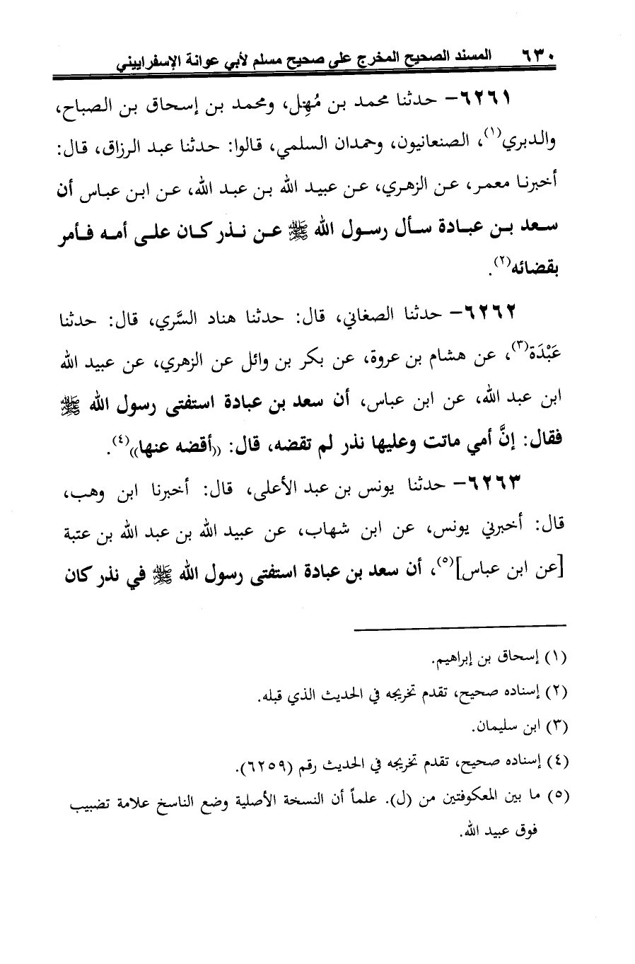 6261 - حدثنا محمد بن مُهِل، ومحمد بن إسحاق بن الصباح، والدبري (¬1)، الصنعانيون، وحمدان السلمي، قالوا: حدثنا عبد الرزاق، قال: أخبرنا معمر، عن الزهري، عن عبيد الله بن عبد الله، عن ابن عباس أن سعد بن عبادة سأل رسول الله صلى الله عليه وسلم عن نذر كان على أمه فأمر بقضائه (¬2).
