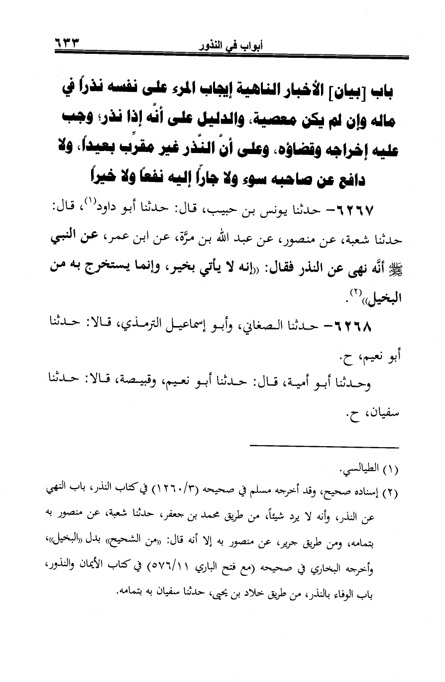 6267 - حدثنا يونس بن حبيب، قال: حدثنا أبو داود (¬1)، قال: حدثنا شعبة، عن منصور، عن عبد الله بن مرَّة، عن ابن عمر، عن النبي -صلى الله عليه وسلم- أنَّه نهى عن النذر فقال: "إنه لا يأتي بخير، وإنما يستخرج به من البخيل" (¬2).