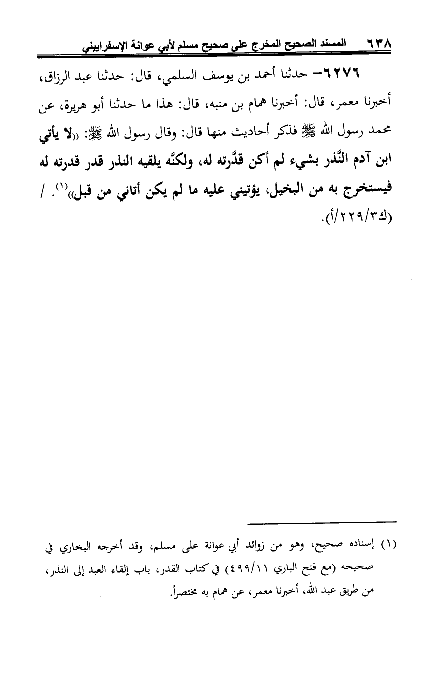 (¬1) إسناده صحيح، وهو من زوائد أبي عوانة على مسلم، وقد أخرجه البخاري في صحيحه (مع فتح الباري 11/ 499) في كتاب القدر، باب إلقاء العبد إلى النذر، من طريق عبد الله، أخبرنا معمر، عن همام به مختصرًا.