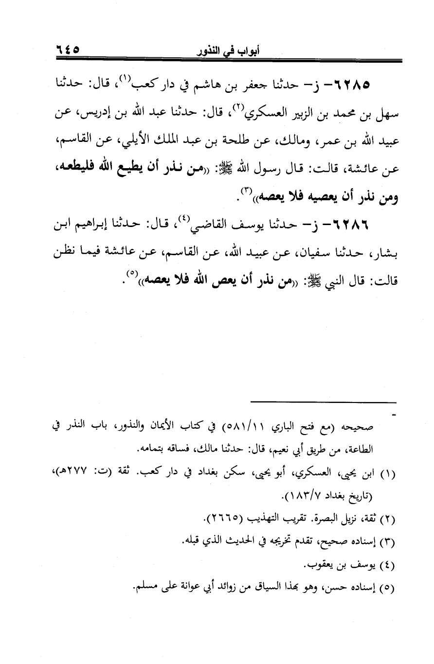6285 - ز- حدثنا جعفر بن هاشم في دار كعب (¬1)، قال: حدثنا سهل بن محمَّد بن الزبير العسكري (¬2)، قال: حدثنا عبد الله بن إدريس، عن عبيد الله بن عمر، ومالك، عن طلحة بن عبد الملك الأيلي، عن القاسم، عن عائشة، قالت: قال رسول الله -صلى الله عليه وسلم-: "من نذر أن يطيع الله فليطعه، ومن نذر أن يعصيه فلا يعصه" (¬3).