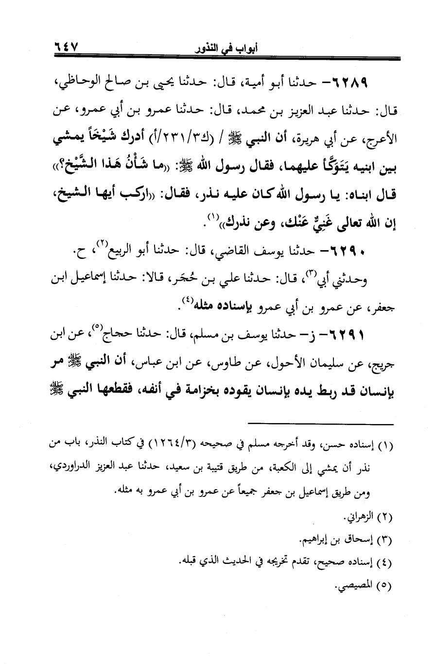 6289 - حدثنا أبو أمية، قال: حدثنا يحيى بن صالح الوحاظي، قال: حدثنا عبد العزيز بن محمَّد، قال: حدثنا عمرو بن أبي عمرو، عن الأعرج، عن أبي هريرة، أن النبي -صلى الله عليه وسلم- أدرك شَيْخًا يمشي بين ابنيه يَتَوَكَّأ عليهما، فقال رسول الله -صلى الله عليه وسلم-: "ما شَأْنُ هَذا الشَّيْخ؟ " قال ابناه: يا رسول الله كان عليه نذر، فقال: "اركب أيها الشيخ، إن الله تعالى غَنِيٌّ عَنْك، وعن نذرك" (¬1).