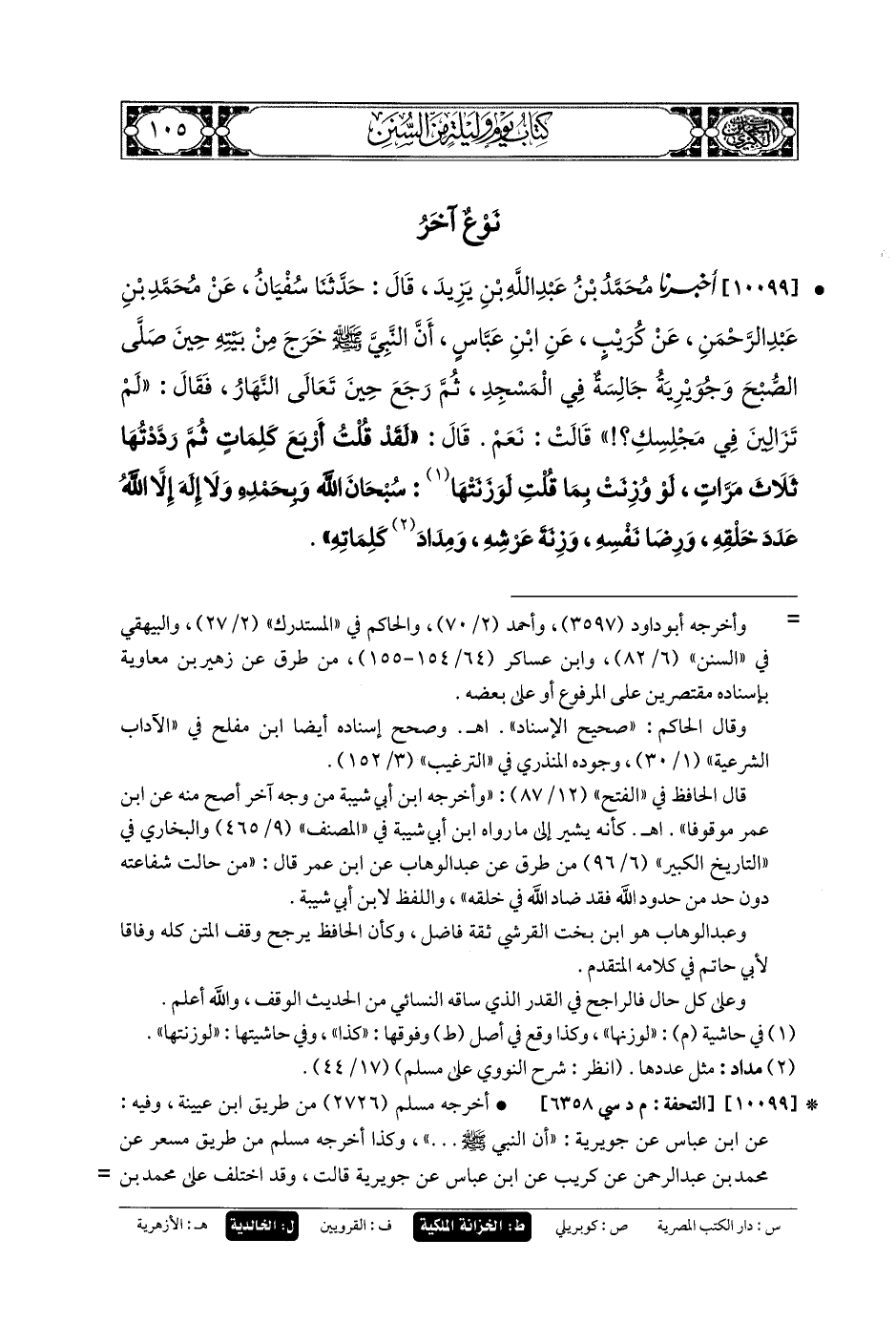 10098- أَخبَرنا عَمرُو بنُ عَليٍّ، قَالَ: حَدثنا عِيسَى بنُ شُعَيبٍ، قَالَ: حَدثنا رَوْحُ بنُ القَاسِمِ، عَن مَطَرٍ، عَن نَافِعٍ، عَنِ ابنِ عُمَرَ قَالَ: قَالَ رَسُولُ اللهِ صَلى الله عَليه وسَلم: اذْكُرُوا عِبَادَ اللهِ، فَإِنَّ العَبدَ إِذَا قَالَ: سُبْحَانَ اللهِ وَبِحَمْدِهِ كَتَبَ اللهُ لَهُ (1) بِهَا عَشْرًا، وَمِنْ عَشْرٍ إِلَى مِئَةٍ، وَمِنْ مِئَةٍ إِلَى أَلْفٍ، فَمَنْ زَادَ، زَادَ اللهُ لَهُ، وَمَنِ اسْتَغْفَرَ، غَفَرَ اللهُ لَهُ.