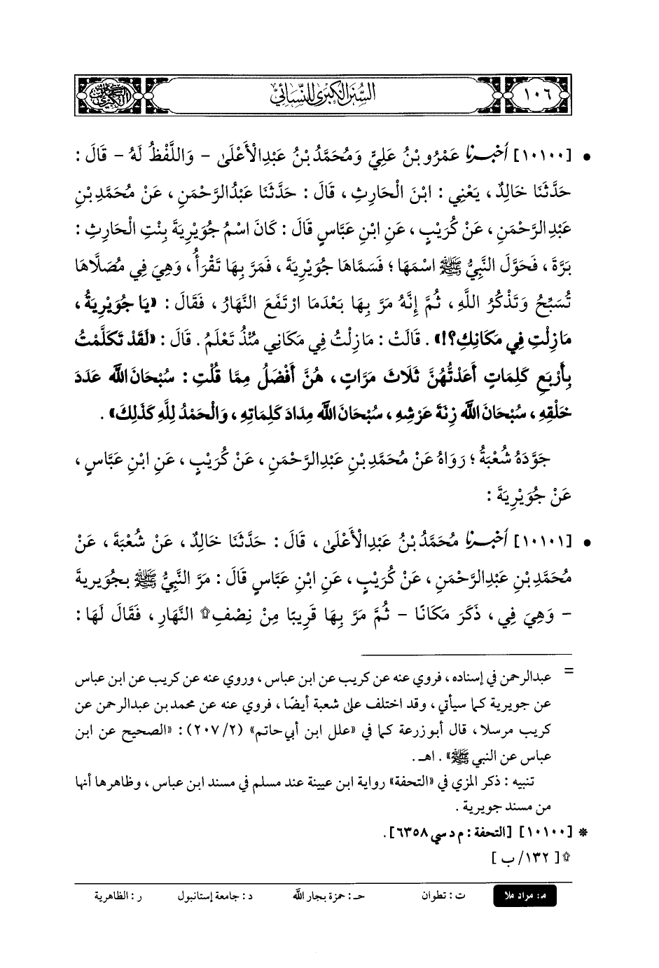 10100- أَخبَرنا عَمرُو بنُ عَليٍّ، وَمُحَمدُ بنُ عَبدِ الأَعْلَى، وَاللَّفْظُ لَهُ، قَالَ: حَدثنا خَالِدٌ، يَعْنِي ابنَ الحَارِثِ، قَالَ: حَدثنا عَبدُ الرَّحمَنِ، عَن مُحَمدِ بنِ عَبدِ الرَّحمَنِ، عَن كُرَيْبٍ، عَنِ ابنِ عَبَّاسٍ قَالَ: كَانَ اسْمُ جُوَيْرِيَةَ بِنْتِ الحَارِثِ بَرَّةَ، فَحَوَّلَ النَّبيُّ صَلى الله عَليه وسَلم اسْمَهَا، فَسَمَّاهَا جُوَيْرِيَةَ، فَمَرَّ بِهَا تَقْرَأُ وَهِيَ فِي مُصَلاَّهَا تُسَبِّحُ وَتَذْكُرُ اللهَ، ثُمَّ إِنَّهُ مَرَّ بِهَا بَعْدَمَا ارْتَفَعَ النَّهَارُ، فَقَالَ: يَا جُوَيْرِيَةُ، مَا زِلْتِ فِي مَكَانِكِ؟ قَالَتْ: مَا زِلْتُ فِي مَكَانِي مُنْذُ تَعْلَمُ، قَالَ: لَقَدْ تَكَلَّمْتُ بِأَرْبَعِ كَلِمَاتٍ أَعَدْتُهُنَّ ثَلاثَ مَرَّاتٍ، هُنَّ أَفْضَلُ مِمَّا قُلْتِ: سُبْحَانَ اللهِ عَدَدَ خَلْقِهِ، سُبْحَانَ اللهِ زِنَةَ عَرْشِهِ، سُبْحَانَ اللهِ مِدَادَ كَلِمَاتِهِ، وَالحَمْدُ للهِ كَذَلِكَ.