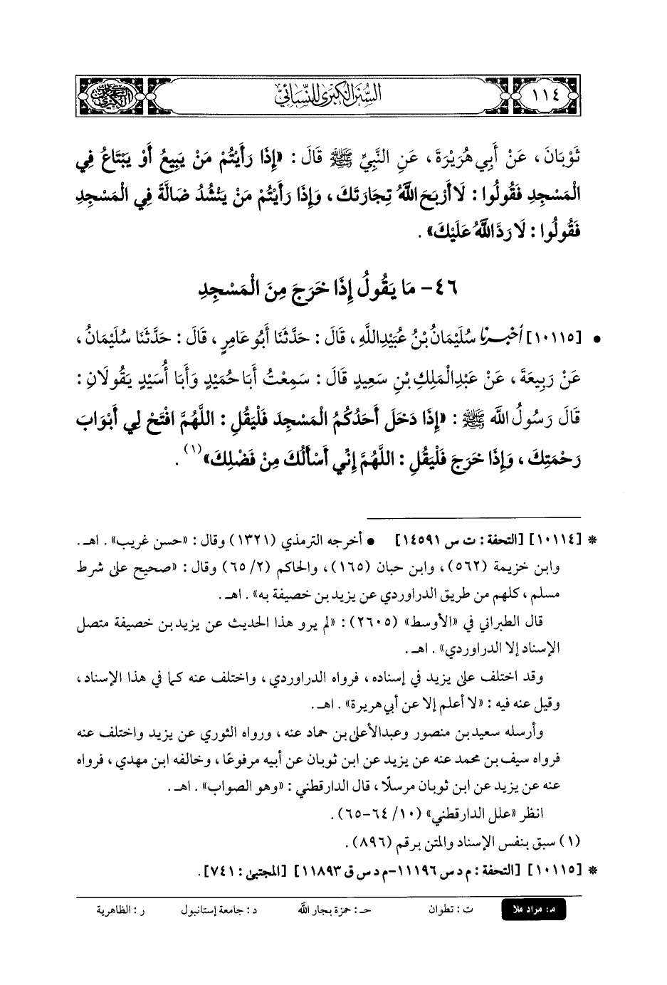 10114- أَخبَرني إِبرَاهِيمُ بنُ يَعقُوبَ، قَالَ: حَدثنا عَليُّ بنُ المَدِينِيِّ، قَالَ: حَدثنا عَبدُ العَزِيزِ بنُ مُحَمدٍ، عَن يَزِيدَ بنِ خُصَيْفَةَ، عَن مُحَمدِ بنِ عَبدِ الرَّحمَنِ بنِ ثَوْبَانَ، عَن أَبي هُرَيرَةَ، عَنِ النَّبيِّ صَلى الله عَليه وسَلم قَالَ: إِذَا رَأَيْتُمْ مَنْ يَبِيعُ أَوْ يَبْتَاعُ فِي المَسْجِدِ، فَقُولُوا: لا أَرْبَحَ اللهُ تِجَارَتَكَ، وَإِذَا رَأَيْتُمْ مَنْ يَنْشُدُ ضَالَّةً فِي المَسْجِدِ، فَقُولُوا: لا رَدَّ اللهُ عَلَيْكَ.