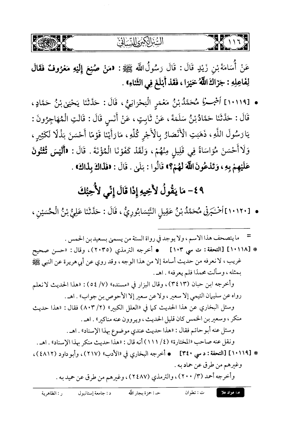 10118- أَخبَرنا إِبرَاهِيمُ بنُ سَعِيدٍ الجَوْهَرِيُّ، قَالَ: حَدثنا الأَحْوَصُ بنُ جَوَّابٍ، عَن سُعَيْرِ بنِ الخِمْسِ، عَن سُلَيمَانَ التَّيْمِيِّ، عَن أَبي عُثْمَانَ، عَن أُسَامَةَ بنِ زَيْدٍ قَالَ: قَالَ رَسُولُ اللهِ صَلى الله عَليه وسَلم: مَنْ صُنِعَ إِلَيْهِ مَعْرُوفٌ فَقَالَ لِفَاعِلِهِ: جَزَاكَ اللهُ خَيْرًا، فَقَدْ أَبْلَغَ فِي الثَّنَاءِ.