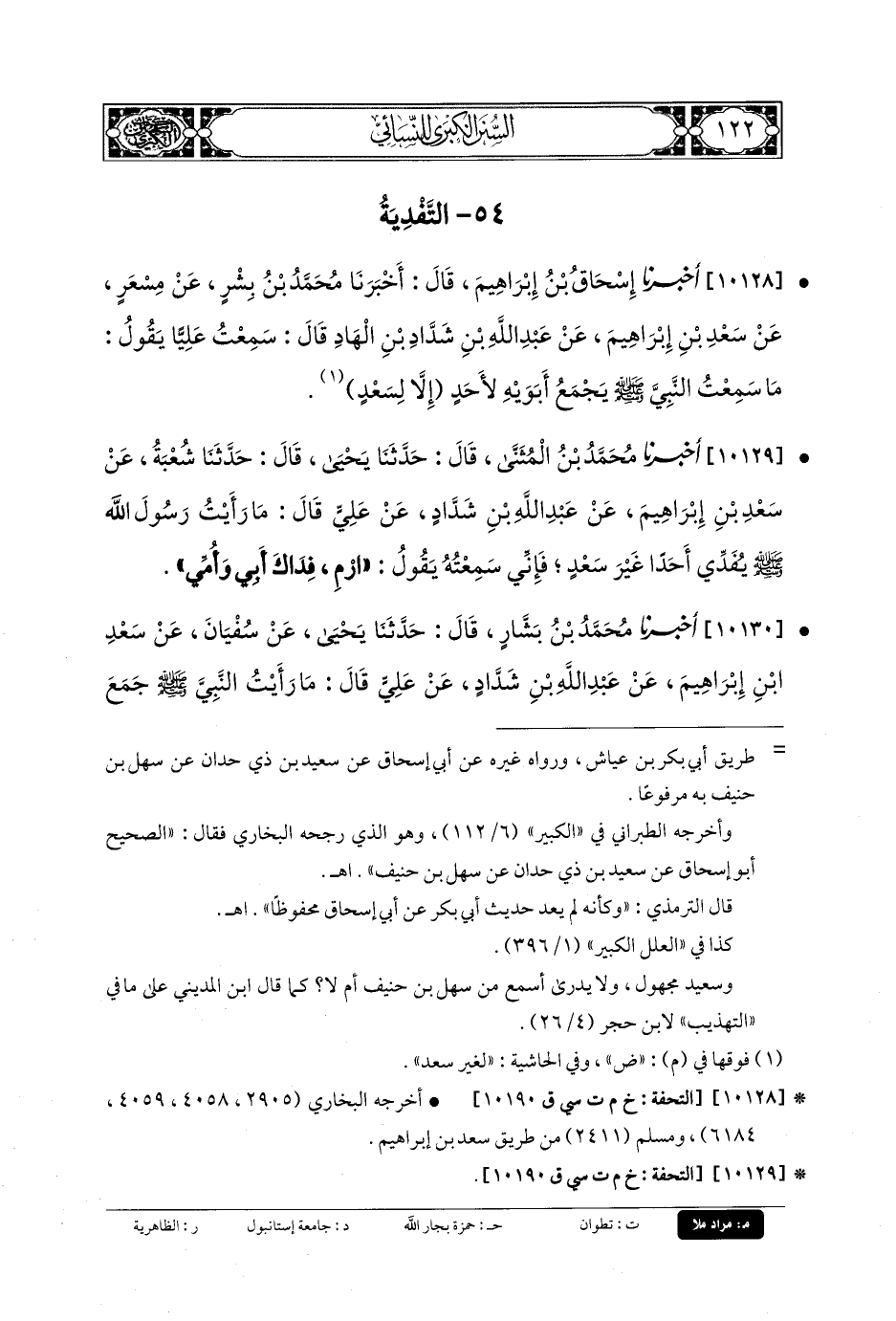 10128- أَخبَرنا إِسحَاقُ بنُ إِبرَاهِيمَ، قَالَ: أَخبَرنا مُحَمدُ بنُ بِشْرٍ، عَن مِسْعَرٍ، عَن سَعْدِ بنِ إِبرَاهِيمَ، عَن عَبدِ اللهِ بنِ شَدَّادِ بنِ الهَادِ، قَالَ: سَمِعْتُ عَليًّا يَقُولُ: مَا سَمِعْتُ النَّبيَّ صَلى الله عَليه وسَلم يَجْمَعُ أَبَوَيْهِ لأَحَدٍ إِلاَّ لِسَعْدٍ.