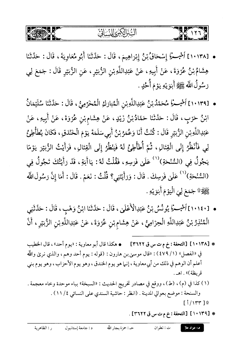 10138- أَخبَرنا إِسحَاقُ بنُ إِبرَاهِيمَ، قَالَ: حَدثنا أَبو مُعاويَةَ، قَالَ: حَدثنا هِشَامُ بنُ عُرْوَةَ، عَن أَبيهِ، عَن عَبدِ اللهِ بنِ الزُّبَيْرِ، عَنِ الزُّبَيْرِ قَالَ: جَمَعَ لِي رَسُولُ اللهِ صَلى الله عَليه وسَلم أَبَوَيْهِ يَوْمَ أُحُدٍ.