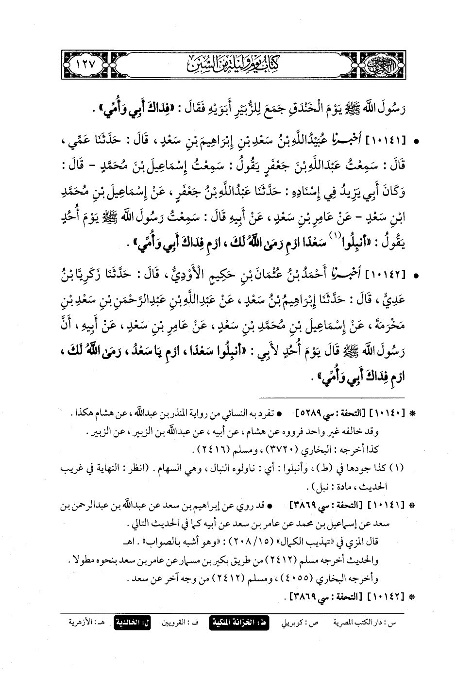 10141- أَخبَرنا عُبَيدُ اللهِ بنُ سَعْدِ بنِ إِبرَاهِيمَ بنِ سَعْدٍ، قَالَ: حَدثنا عَمِّي، قَالَ: سَمِعْتُ عَبدَ اللهِ بْنَ جَعفَرٍ يَقُولُ: سَمِعْتُ إِسمَاعِيلَ بْنَ مُحَمدٍ قَالَ: وَكَانَ أَبي يَزِيدُ فِي إِسنَادِهِ، حَدثنا عَبدُ اللهِ بنُ جَعفَرٍ، عَن إِسمَاعِيلَ بنِ مُحَمدِ بنِ سَعْدٍ، عَن عَامِرِ بنِ سَعْدٍ، عَن أَبيهِ، قَالَ: سَمِعْتُ رَسُولَ اللهِ صَلى الله عَليه وسَلم يَوْمَ أُحُدٍ يَقُولُ: أَنْبِلُوا سَعْدًا، ارْمِ، رَمَى اللهُ لَكَ، ارْمِ، فِدَاكَ أَبي وَأُمِّي.