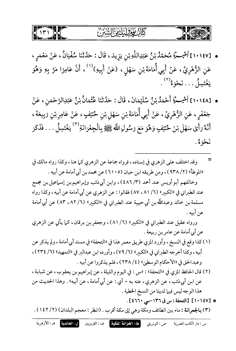10147- أَخبَرنا مُحَمدُ بنُ عَبدِ اللهِ بنِ يَزِيدَ، قَالَ: حَدثنا سُفيانُ، عَن مَعْمَرٍ، عَنِ الزُّهْرِيِّ، عَن أَبي أُمَامَةَ بنِ سَهْلٍ، عَن أَبيهِ؛ أَنَّ عَامِرًا مَرَّ بِهِ وَهُوَ يَغْتَسِلُ، نَحْوَهُ.