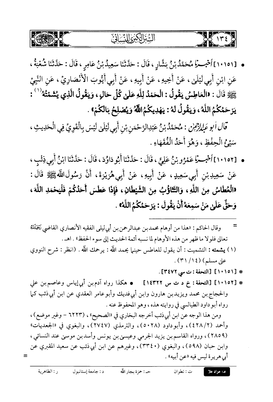 10150- أَخبَرنا أَبو دَاوُدَ، قَالَ: حَدثنا يَحيَى بنُ حَمَّادٍ، قَالَ: حَدثنا أَبو عَوَانَةَ، عَن مُحَمدِ بنِ عَبدِ الرَّحمَنِ بنِ أَبي لَيْلَى، عَن أَخِيهِ عِيسَى، عَن عَبدِ الرَّحمَنِ بنِ أَبي لَيْلَى، عَن عَليٍّ، عَنِ النَّبيِّ صَلى الله عَليه وسَلم قَالَ: إِذَا عَطَسَ أَحَدُكُمْ فَلْيَقُلِ: الحَمْدُ للهِ عَلَى كُلِّ حَالٍ، وَيُرَدُّ عَلَيْهِ: يَرْحَمُكُمُ اللهُ، وَيُرَدُّ عَلَيْهِمْ: يَغْفِرُ اللهُ لَنَا وَلَكُمْ.