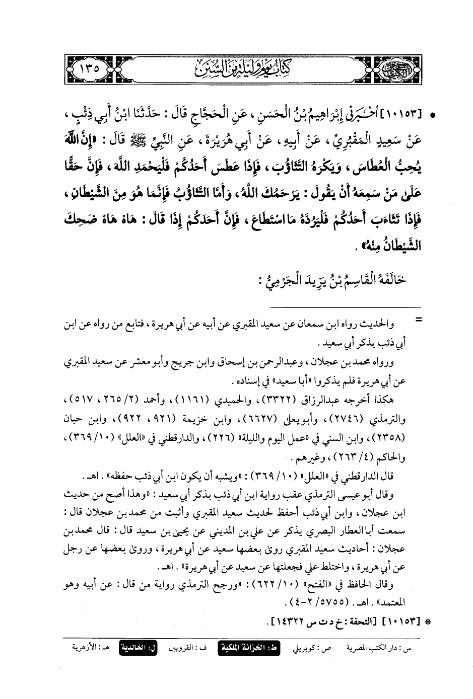 10152- أَخبَرنا عَمرُو بنُ عَليٍّ، قَالَ: حَدثنا أَبو دَاوُدَ، قَالَ: حَدثنا ابنُ أَبي ذِئْبٍ، عَن سَعِيدِ بنِ أَبي سَعِيدٍ، عَن أَبيهِ، عَن أَبي هُرَيرَةَ، أَنَّ رَسُولَ اللهِ صَلى الله عَليه وسَلم قَالَ: العُطَاسُ مِنَ اللهِ، وَالتَّثَاؤُبُ مِنَ الشَّيْطَانِ، فَإِذَا عَطَسَ أَحَدُكُمْ، فَلْيَحْمَدِ اللهُ، وَحَقٌّ عَلَى مَنْ سَمِعَهُ أَنْ يَقُولَ: يَرْحَمُكُمُ اللهُ.