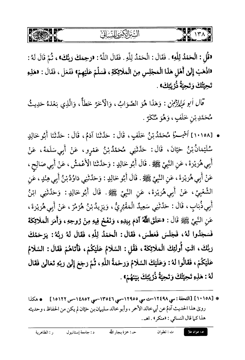10157- أَخبَرنا قُتَيبَةُ بنُ سَعِيدٍ، قَالَ: حَدثنا اللَّيْثُ، عَنِ ابنِ عَجْلانَ، عَن سَعِيدٍ، عَن أَبيهِ، عَن عَبدِ اللهِ بنِ سَلامٍ قَالَ: خَلَقَ اللهُ آدَمَ فِي آخِرِ سَاعَةٍ مِنْ يَوْمِ الجُمُعَةِ، ثُمَّ نَفَخَ فِيهِ مِنْ رُوحِهِ، فَلَمَّا تَبَالَغَ فِيهِ الرُّوحُ عَطَسَ، فَقَالَ اللهُ عَزَّ وَجَلَّ لَهُ: قُلِ: الحَمْدُ للهِ، فَقَالَ: الحَمْدُ للهِ، فَقَالَ اللهُ: رَحِمَكَ رَبُّكَ، ثُمَّ قَالَ لَهُ: اذْهَبْ إِلَى أَهْلِ هَذَا المَجْلِسِ مِنَ المَلائِكَةِ فَسَلِّمْ عَلَيْهِمْ، فَفَعَلَ، فَقَالَ: هَذِهِ تَحِيَّتُكَ وَتَحِيَّةُ ذُرِّيَّتِكَ.