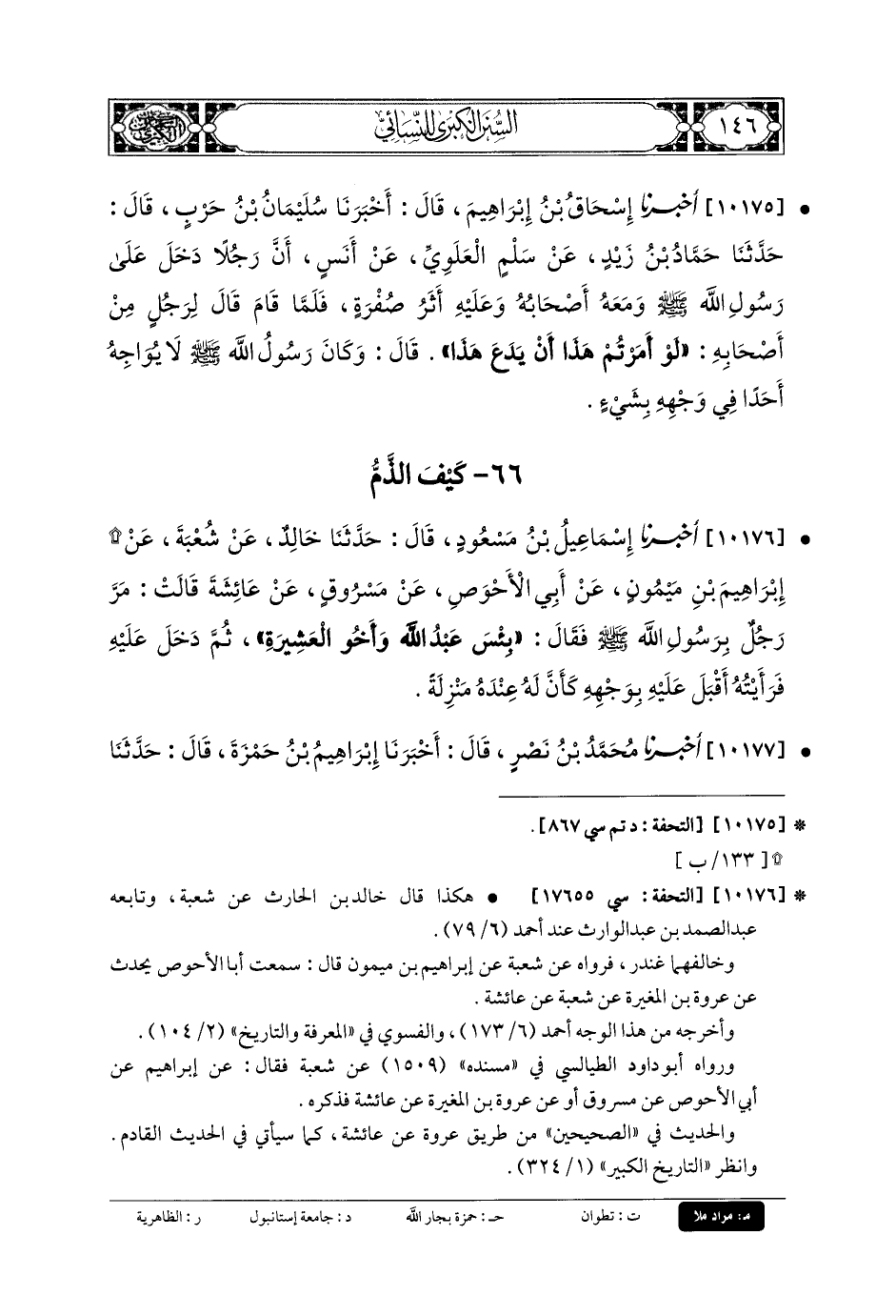 10175- أَخبَرنا إِسحَاقُ بنُ إِبرَاهِيمَ، قَالَ: أَخبَرنا سُلَيمَانُ بنُ حَرْبٍ، قَالَ: حَدثنا حَمَّادُ بنُ زَيْدٍ، عَن سَلْمٍ العَلَوِيِّ، عَن أَنَسٍ، أَنَّ رَجُلاً دَخَلَ عَلَى رَسُولِ اللهِ صَلى الله عَليه وسَلم وَمَعَهُ أَصْحَابُهُ، وَعَلَيْهِ أَثَرُ صُفْرَةٍ، فَلَمَّا قَامَ قَالَ لِرَجُلٍ مِنْ أَصْحَابِهِ: لَوْ أَمَرْتُمْ هَذَا أَنْ يَدَعَ هَذَا، قَالَ: وَكَانَ رَسُولُ اللهِ صَلى الله عَليه وسَلم لا يُوَاجِهُ أَحَدًا فِي وَجْهِهِ بِشَيْءٍ.