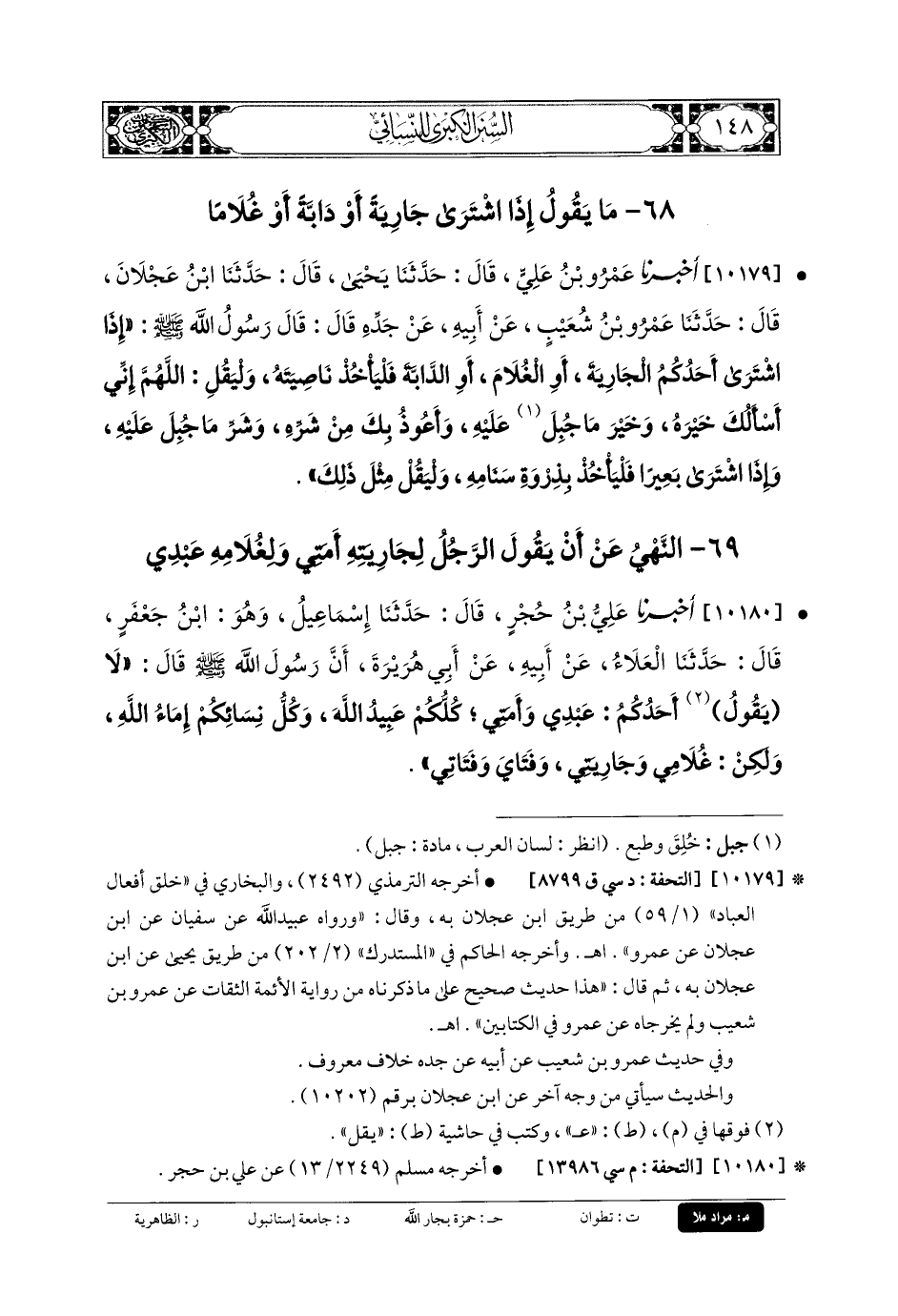 10179- أَخبَرنا عَمرُو بنُ عَليٍّ، قَالَ: حَدثنا يَحيَى، قَالَ: حَدثنا ابنُ عَجْلانَ، قَالَ: حَدثنا عَمرُو بنُ شُعَيبٍ، عَن أَبيهِ، عَن جَدِّهِ قَالَ: قَالَ رَسُولُ اللهِ صَلى الله عَليه وسَلم: إِذَا اشْتَرَى أَحَدُكُمُ الجَارِيَةَ أَوِ الغُلامَ أَوِ الدَّابَّةَ، فَلْيَأْخُذْ نَاصِيَتَهُ وَلْيَقُلِ: اللهُمَّ إِنِّي أَسْأَلُكَ خَيَّرَهُ وَخَيْرَ مَا جُبِلَ عَلَيْهِ، وَأَعُوذُ بِكَ مِنْ شَرِّهِ وَشَرِّ مَا جُبِلَ عَلَيْهِ، وَإِذَا اشْتَرَى بَعِيرًا فَلْيَأْخُذْ بِذِرْوَةِ سَنَامِهِ، وَلْيَقُلْ مِثْلَ ذَلِكَ.