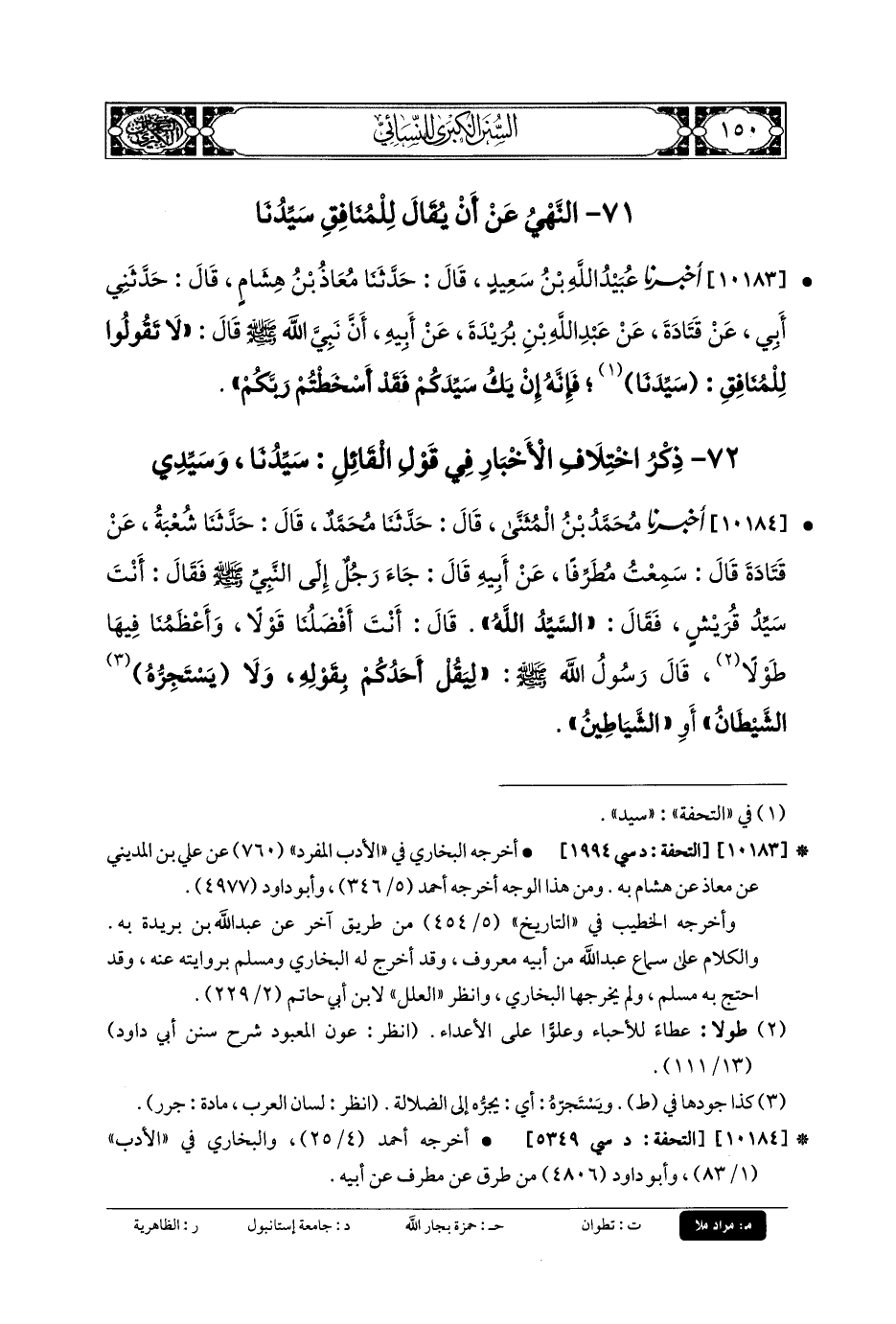 10183- أَخبَرنا عُبَيدُ اللهِ بنُ سَعِيدٍ، قَالَ: حَدثنا مُعَاذُ بنُ هِشَامٍ، قَالَ: حَدَّثني أَبي، عَن قَتَادَةَ، عَن عَبدِ اللهِ بنِ بُرَيْدَةَ، عَن أَبيهِ؛ أَنَّ نَبِيَّ اللهِ صَلى الله عَليه وسَلم قَالَ: لا تَقُولُوا لِلْمُنَافِقِ: سَيِّدُنَا، فَإِنَّهُ إنْ يَكُ سَيِّدَكُمْ فَقَدْ أَسْخَطْتُمْ رَبَّكُمْ.
