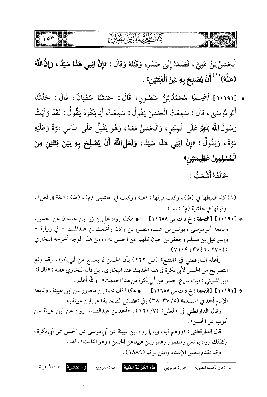 10190- أَخبَرنا قُتَيبَةُ بنُ سَعِيدٍ، قَالَ: حَدثنا حَمَّادُ بنُ زَيْدٍ، عَن عَليِّ بنِ زَيْدٍ، عَنِ الحَسَنِ، عَن أَبي بَكْرَةَ، أَنَّ رَسُولَ اللهِ صَلى الله عَليه وسَلم خَطَبَ النَّاسَ، فَصَعِدَ إِلَيْهِ الحَسَنُ بنُ عَليٍّ، فَضَمَّهُ إِلَى صَدْرِهِ وَقَبَّلَهُ، وَقَالَ: إنَّ ابنِي هَذَا سَيِّدٌ، وَإنَّ اللهَ عَلَّهُ أَنْ يُصْلِحَ بِهِ بَيْنَ الفِئَتَيْنِ.