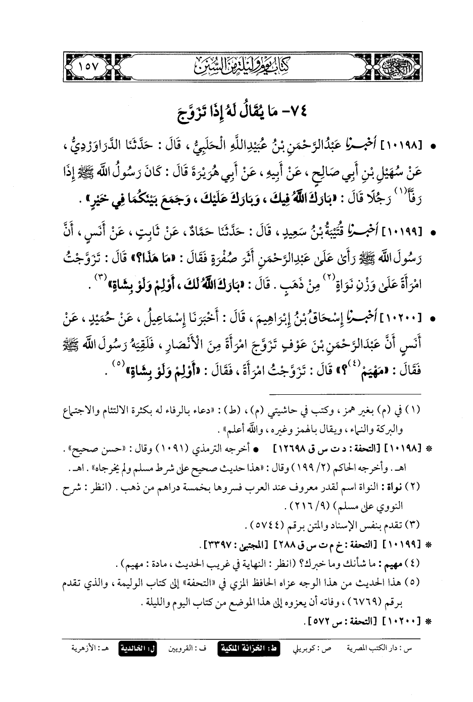 10199- أَخبَرنا قُتَيبَةُ بنُ سَعِيدٍ، قَالَ: حَدثنا حَمَّادٌ، عَن ثَابِتٍ، عَن أَنَسٍ، أَنَّ رَسُولَ اللهِ صَلى الله عَليه وسَلم رَأَى عَلَى عَبدِ الرَّحمَنِ أَثَرَ صُفْرَةٍ، فَقَالَ: مَا هَذَا؟ قَالَ: تَزَوَّجْتُ امْرَأَةً عَلَى وَزْنِ نَوَاةٍ مِنْ ذَهَبٍ، قَالَ: بَارَكَ اللهُ لَكَ، أَوْلِمْ وَلَوْ بِشَاةٍ.