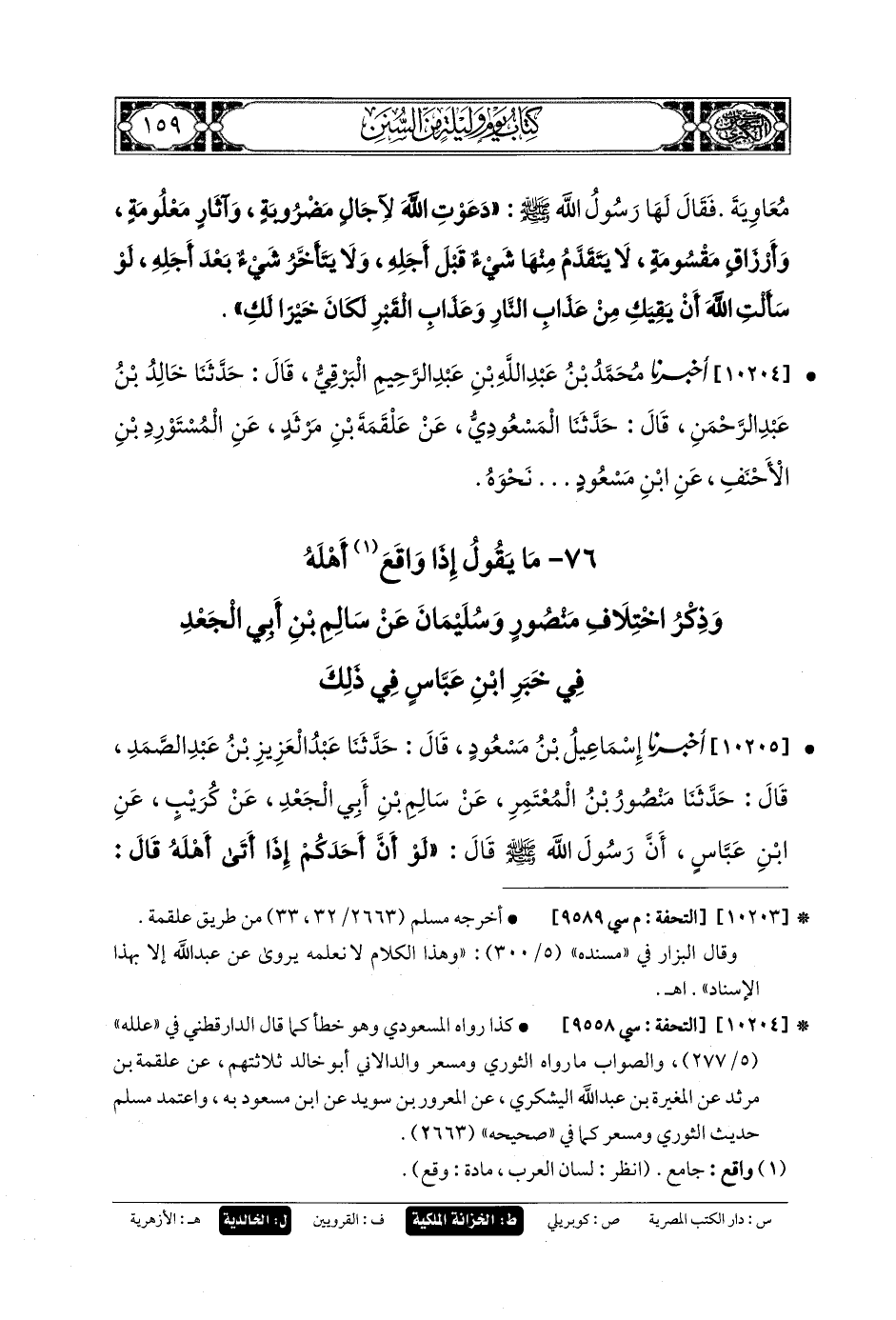 10203- أَخبَرنا مُحَمدُ بنُ مَنصُورٍ، قَالَ: حَدثنا سُفيانُ، عَن مِسْعَرٍ، عَن عَلْقَمَةَ بنِ مَرْثَدٍ، عَنِ المُغِيرَةِ اليَشْكُرِيِّ، عَنِ المَعْرُورِ، عَن عَبدِ اللهِ قَالَ: قَالَتْ أُمُّ حَبِيبَةَ: اللهُمَّ أَمْتِعْنِي بِزَوْجِي رَسُولِ اللهِ صَلى الله عَليه وسَلم، وَبِأَبي أَبي سُفيانَ، وَبِأَخِي مُعاويَةَ، فَقَالَ لَهَا رَسُولُ اللهِ صَلى الله عَليه وسَلم: دَعَوْتِ اللهَ لآجَالٍ مَضْرُوبَةٍ، وَآثَارٍ مَعْلُومَةٍ، وَأَرْزَاقٍ مَقْسُومَةٍ، لا يَتَقَدَّمُ مِنْهَا شَيْءٌ قَبْلَ أَجَلِهِ، وَلا يَتَأَخَّرُ شَيْءٌ بَعْدَ أَجَلِهِ، لَوْ سَأَلْتِ اللهَ أَنْ يَقِيَكِ مِنْ عَذَابِ النَّارِ وَعَذَابِ القَبْرِ لَكَانَ خَيْرًا لَكَ.