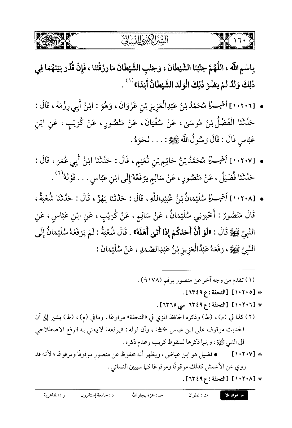 10205- أَخبَرنا إِسمَاعِيلُ بنُ مَسْعُودٍ، قَالَ: حَدثنا عَبدُ العَزِيزِ بنُ عَبدِ الصَّمَدِ، قَالَ: حَدثنا مَنصُورُ بنُ المُعْتَمِرِ، عَن سَالِمِ بنِ أَبي الجَعْدِ، عَن كُرَيْبٍ، عَنِ ابنِ عَبَّاسٍ، أَنَّ رَسُولَ اللهِ صَلى الله عَليه وسَلم قَالَ: لَوْ أَنَّ أَحَدَكُمْ إِذَا أَتَى أَهْلَهُ قَالَ: بِسْمِ اللهِ، اللهُمَّ جَنِّبْنَا الشَّيْطَانَ وَجَنِّبِ الشَّيْطَانَ مَنْ رَزَقْتَنَا، فَإِنْ قُدِّرَ بَيْنَهُمَا فِي ذَلِكَ وَلَدٌ لَمْ يَضُرَّ ذَلِكَ الوَلَدَ الشَّيْطَانُ أَبَدًا.