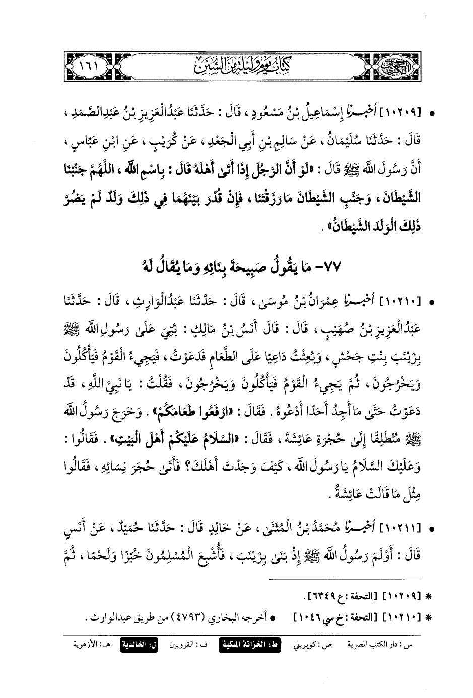 10210- أَخبَرنا عِمْرَانُ بنُ مُوسَى، قَالَ: حَدثنا عَبدُ الوَارِثِ، قَالَ: حَدثنا عَبدُ العَزِيزِ بنُ صُهَيْبٍ، قَالَ: قَالَ أَنَسُ بنُ مَالِكٍ: بُنِيَ عَلَى رَسُولِ اللهِ صَلى الله عَليه وسَلم بِزَيْنَبَ بِنْتِ جَحْشٍ، وَبُعِثْتُ دَاعِيًا عَلَى الطَّعَامِ، فَدَعَوْتُ فَيَجِيءُ القَوْمُ فَيَأْكُلُونَ وَيَخْرُجُونَ، ثُمَّ يَجِيءُ القَوْمُ فَيَأْكُلُونَ وَيَخْرُجُونَ، فَقُلْتُ: يَا نَبِيَّ اللهِ، قَدْ دَعَوْتُ حَتَّى مَا أَجِدُ أَحَدًا أَدْعُوهُ، فَقَالَ: ارْفَعُوا طَعَامَكُمْ، وَخَرَجَ رَسُولُ اللهِ صَلى الله عَليه وسَلم مُنْطَلِقًا إِلَى حُجْرَةِ عَائِشَةَ فَقَالَ: السَّلامُ عَلَيْكُمْ أَهْلَ البَيْتِ، فَقَالُوا: وَعَلَيْكَ السَّلامُ يَا رَسُولَ اللهِ، كَيْفَ وَجَدْتَ أَهْلَكَ؟ فَأَتَى حُجَرَ نِسَائِهِ، فَقَالُوا مِثْلَ مَا قَالَتْ عَائِشَةُ.