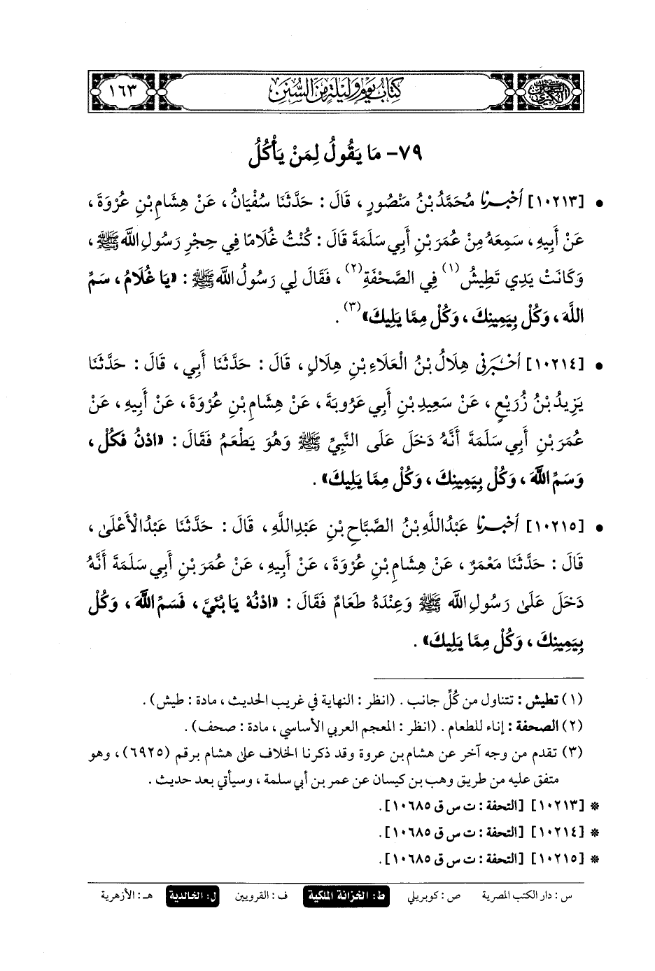 10213- أَخبَرنا مُحَمدُ بنُ مَنصُورٍ، قَالَ: حَدثنا سُفيانُ، عَن هِشَامِ بنِ عُرْوَةَ، عَن أَبيهِ، سَمِعَهُ مِنْ عُمَرَ بنِ أَبي سَلَمَةَ قَالَ: كُنْتُ غُلامًا فِي حِجْرِ رَسُولِ اللهِ صَلى الله عَليه وسَلم، وَكَانَتْ يَدِي تَطِيشُ فِي الصَّحْفَةِ، فَقَالَ لِي رَسُولُ اللهِ صَلى الله عَليه وسَلم: يَا غُلامُ، سَمِّ اللهَ، وَكُلْ بِيَمِينِكَ، وَكُلْ مِمَّا يَلِيكَ.