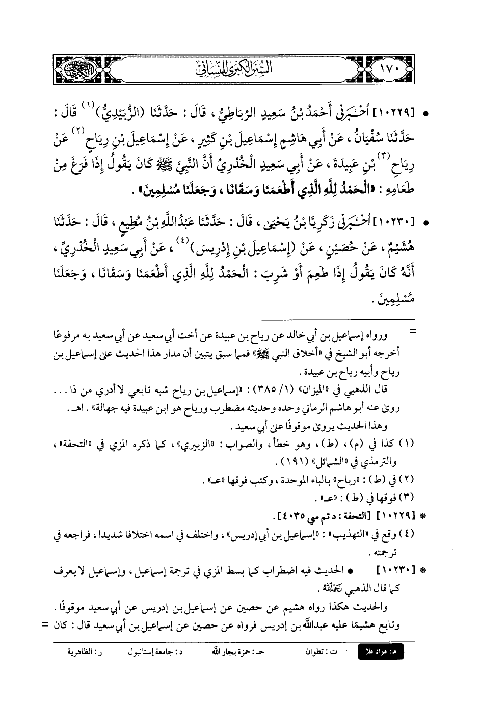 10229- أَخبَرني أَحْمَدُ بنُ سَعِيدٍ الرِّبَاطِيُّ، قَالَ: حَدثنا الزُّبَيْرِيُّ (1)، قَالَ: حَدثنا سُفيانُ، عَن أَبي هَاشِمٍ إِسمَاعِيلَ بنِ كَثِيرٍ، عَن إِسمَاعِيلَ بنِ رِيَاحٍ، عَن رِيَاحِ بنِ عَبِيدَةَ، عَن أَبي سَعِيدٍ الخُدْرِيِّ، أَنَّ النَّبيَّ صَلى الله عَليه وسَلم كَانَ يَقُولُ إِذَا فَرَغَ مِنْ طَعَامِهِ: الحَمْدُ للهِ الَّذِي أَطْعَمَنَا وَسَقَانَا وَجَعَلَنَا مُسْلِمِينَ.