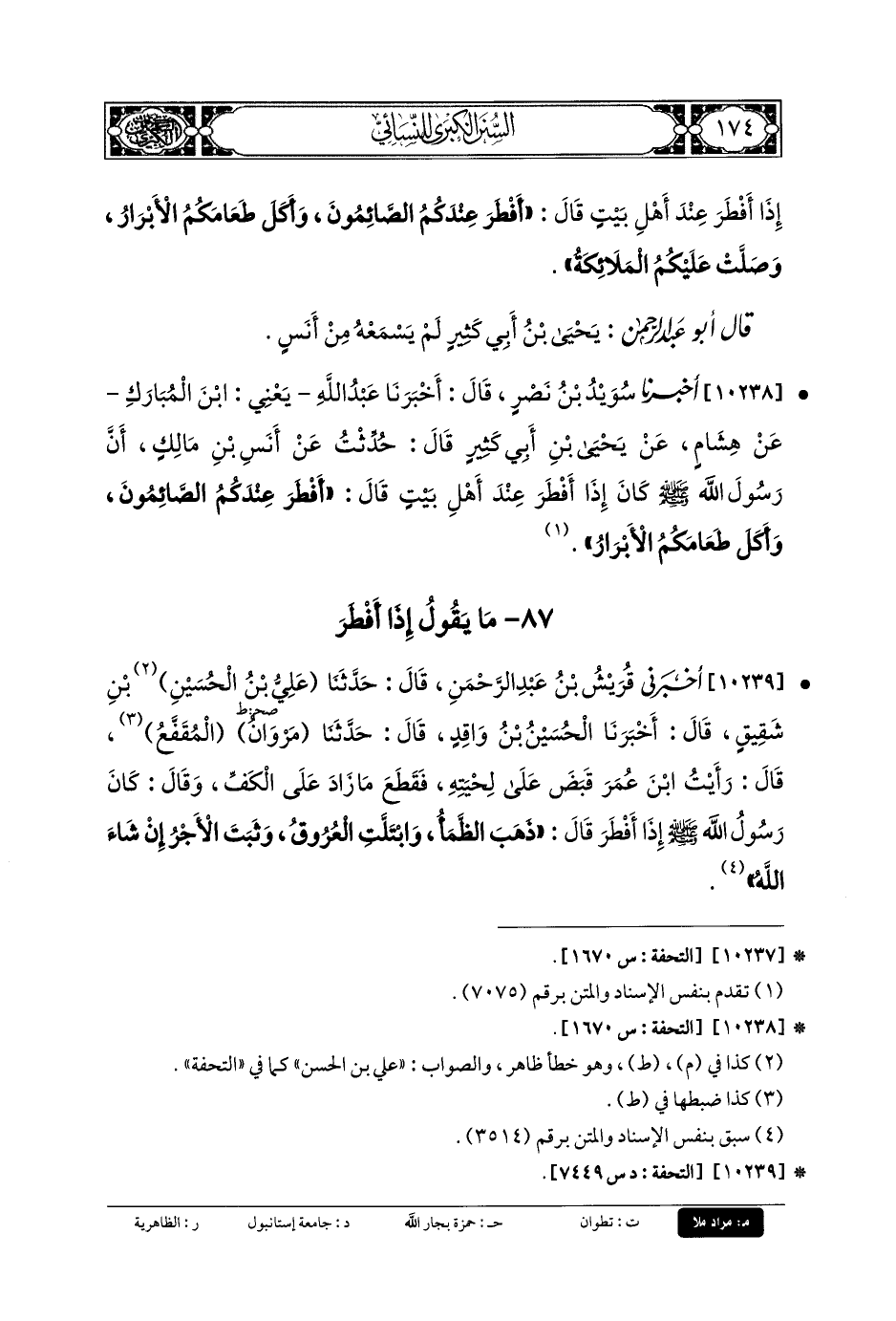 10238- أَخبَرنا سُوَيْدُ بنُ نَصْرٍ، قَالَ: أَخبَرنا عَبدُ اللهِ، يَعْنِي ابنَ المُبَارَكِ، عَن هِشَامٍ، عَن يَحيَى بنِ أَبي كَثِيرٍ، قَالَ: حُدِّثْتُ عَن أَنَسِ بنِ مَالِكٍ، أَنَّ رَسُولَ اللهِ صَلى الله عَليه وسَلم كَانَ إِذَا أَفْطَرَ عِنْدَ أَهْلِ بَيْتٍ قَالَ: أَفْطَرَ عِنْدَكُمُ الصَّائِمُونَ، وَأَكَلَ طَعَامَكُمُ الأَبْرَارُ.