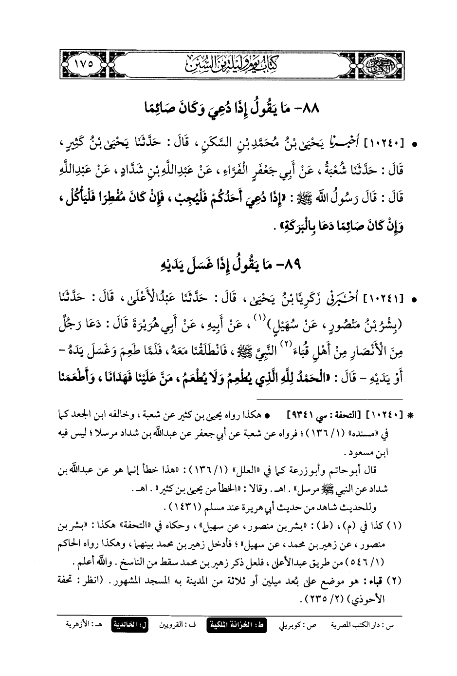 10240- أَخبَرنا يَحيَى بنُ مُحَمدِ بنِ السَّكَنِ، قَالَ: حَدثنا يَحيَى بنُ كَثِيرٍ، قَالَ: حَدثنا شُعبَةُ، عَن أَبي جَعفَرٍ الفَرَّاءِ، عَن عَبدِ اللهِ بنِ شَدَّادٍ، عَن عَبدِ اللهِ قَالَ: قَالَ رَسُولُ اللهِ صَلى الله عَليه وسَلم: إِذَا دُعِيَ أَحَدُكُمْ فَلْيُجِبْ، فَإِنْ كَانَ مُفْطِرًا فَلْيَأْكُلْ، وَإنْ كَانَ صَائِمًا دَعَا بِالبَرَكَةِ.