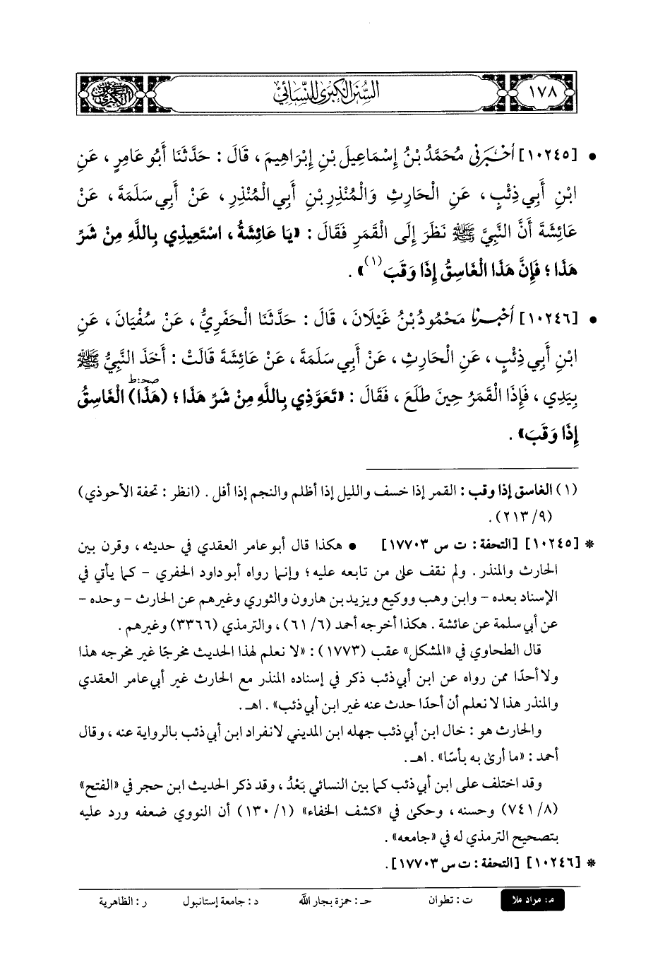10245- أَخبَرني مُحَمدُ بنُ إِسمَاعِيلَ بنِ إِبرَاهِيمَ، قَالَ: حَدثنا أَبو عَامِرٍ، عَنِ ابنِ أَبي ذِئْبٍ، عَنِ الحَارِثِ، وَالمُنْذِرِ بنِ أَبي المُنْذِرِ، عَن أَبي سَلَمَةَ، عَن عَائِشَةَ، أَنَّ النَّبيَّ صَلى الله عَليه وسَلم نَظَرَ إِلَى القَمَرِ فَقَالَ: يَا عَائِشَةُ اسْتَعِيذِي بِاللهِ مِنْ شَرِّ هَذَا، فَإِنَّ هَذَا الغَاسِقُ إِذَا وَقَبَ.