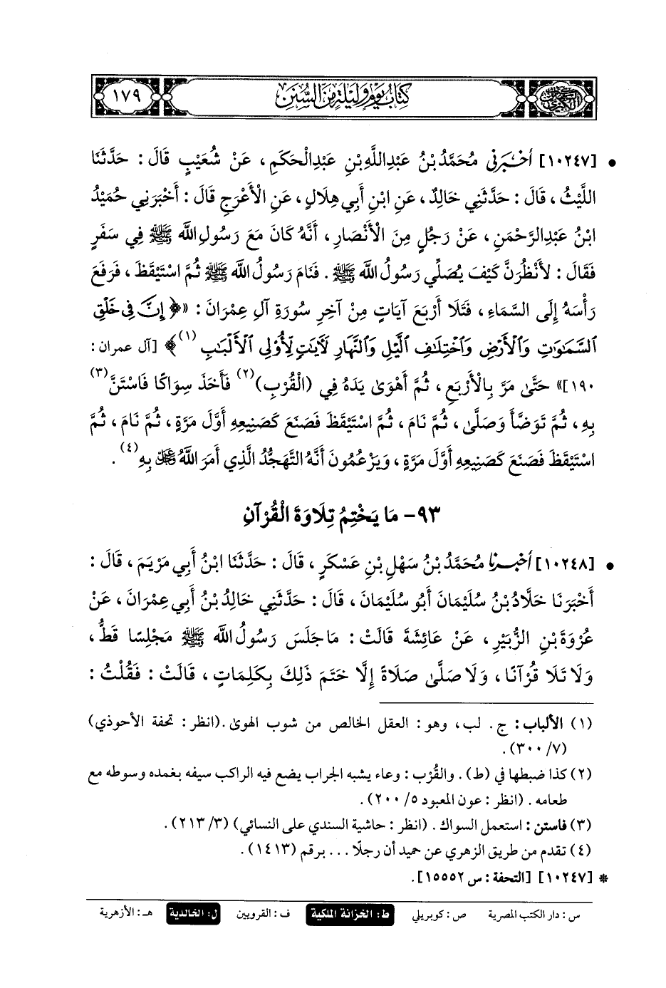 10247- أَخبَرني مُحَمدُ بنُ عَبدِ اللهِ بنِ عَبدِ الحَكَمِ، عَن شُعَيبٍ، قَالَ: حَدثنا اللَّيْثُ، قَالَ: حَدَّثني خَالِدٌ، عَنِ ابنِ أَبي هِلالٍ، عَنِ الأَعْرَجِ، قَالَ: أَخبَرني حُمَيْدُ بنُ عَبدِ الرَّحمَنِ، عَن رَجُلٍ مِنَ الأَنْصَارِ، أَنَّهُ كَانَ مَعَ رَسُولِ اللهِ صَلى الله عَليه وسَلم فِي سَفَرٍ فَقَالَ: لأَنْظُرَنَّ كَيْفَ يُصَلِّي رَسُولُ اللهِ صَلى الله عَليه وسَلم، فَنَامَ رَسُولُ اللهِ صَلى الله عَليه وسَلم، ثُمَّ اسْتَيْقَظَ، فَرَفَعَ رَأْسَهُ إِلَى السَّمَاءِ، فَتَلا أَرْبَعَ آيَاتٍ مِنْ آخِرِ سُورَةِ آلِ عِمْرَانَ: {إِنَّ فِي خَلْقِ السَّمَاوَاتِ وَالأَرْضِ وَاخْتِلافِ اللَّيْلِ وَالنَّهَارِ لَآيَاتٍ لأُولِي الأَلْبَابِ} حَتَّى مَرَّ بِالأَرْبَعِ، ثُمَّ أَهْوَى يَدَهُ فِي القُرْبِ، فَأَخَذَ سِوَاكًا فَاسْتَنَّ بِهِ، ثُمَّ تَوَضَّأَ وَصَلَّى، ثُمَّ نَامَ، ثُمَّ اسْتَيْقَظَ، فَصَنَعَ كَصَنِيعِهِ أَوَّلَ مَرَّةٍ، ثُمَّ نَامَ، ثُمَّ اسْتَيْقَظَ، فَصَنَعَ كَصَنِيعِهِ أَوَّلَ مَرَّةً، وَيَزْعُمُونَ أَنَّهُ التَّهَجُّدُ الَّذِي أَمَرَ اللهُ عَزَّ وَجَلَّ بِهِ.