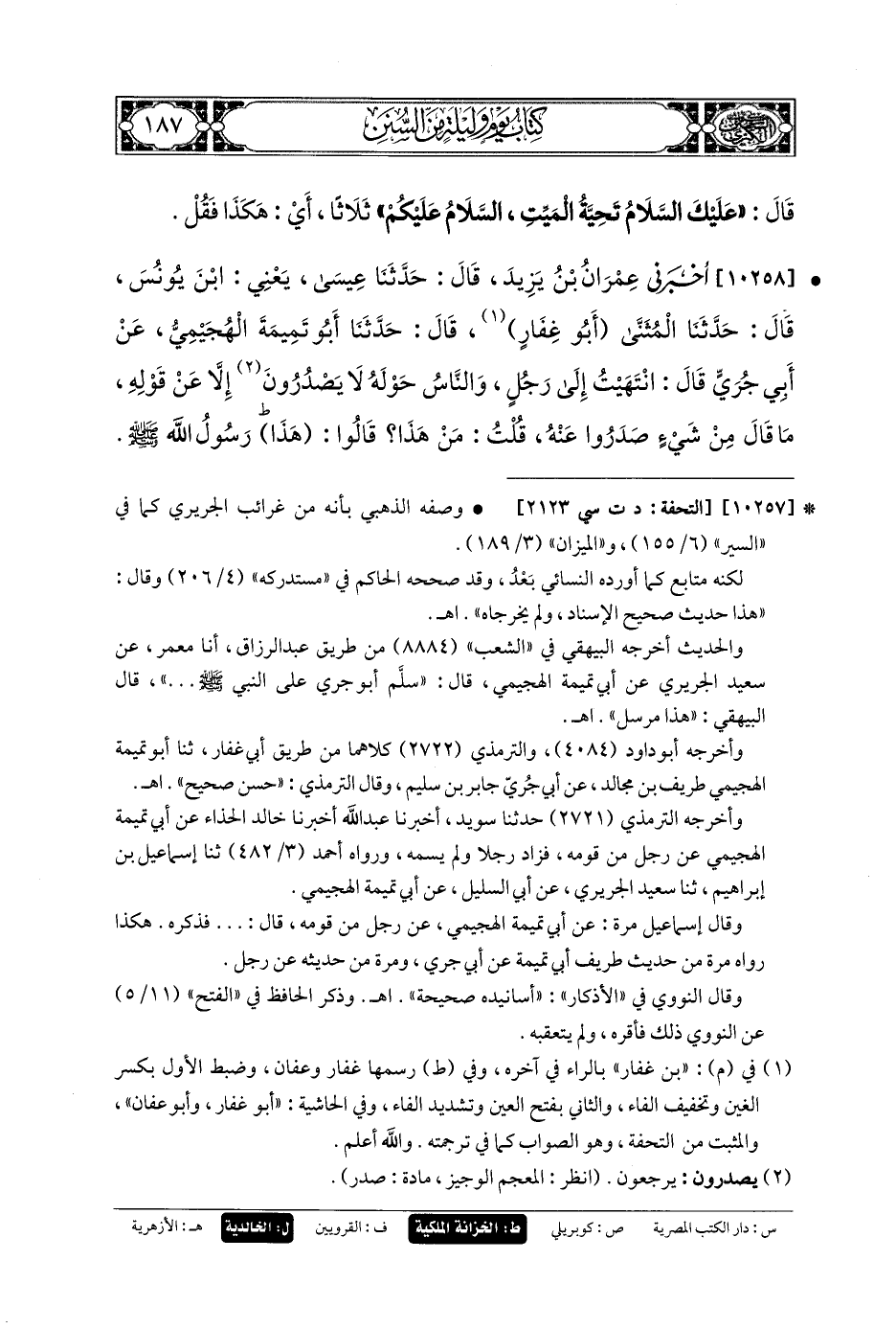 10257- أَخبَرني إِبرَاهِيمُ بنُ يَعقُوبَ، قَالَ: حَدثنا عَبدُ الصَّمَدِ بنُ عَبدِ الوَارِثِ، قَالَ: حَدثنا أَبي، قَالَ: حَدثنا الجُرَيْرِيُّ، عَن أَبي السَّلِيلِ، عَن أَبي تَمِيمَةَ، عَن جَابِرِ بنِ سُلَيْمٍ قَالَ: لَقِيتُ رَسُولَ اللهِ صَلى الله عَليه وسَلم فَقُلْتُ: عَلَيْكُمُ السَّلامُ يَا رَسُولَ اللهِ، قَالَ: عَلَيْكَ السَّلامُ، تَحِيَّةُ المَيِّتِ، السَّلامُ عَلَيْكُمْ ثَلاثًا، أَيْ هَكَذَا فَقُلْ.