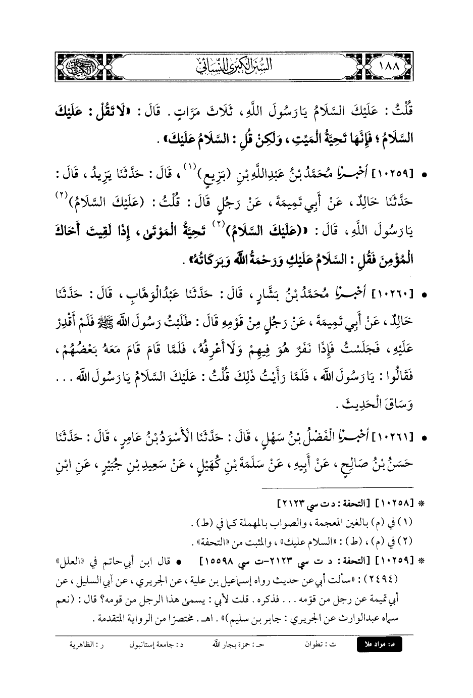 10260- أَخبَرنا مُحَمدُ بنُ بَشَّارٍ، قَالَ: حَدثنا عَبدُ الوَهَّابِ، قَالَ: حَدثنا خَالِدٌ، عَن أَبي تَمِيمَةَ، عَن رَجُلٍ مِنْ قَوْمِهِ قَالَ: طَلَبْتُ رَسُولَ اللهِ صَلى الله عَليه وسَلم فَلَمْ أَقْدِرْ عَلَيْهِ، فَجَلَسْتُ، فَإِذَا نَفَرٌ هُوَ فِيهِمْ وَلا أَعْرِفُهُ، فَلَمَّا قَامَ، قَامَ مَعَهُ بَعْضُهُمْ فَقَالُوا: يَا رَسُولَ اللهِ، فَلَمَّا رَأَيْتُ ذَلِكَ، قُلْتُ: عَلَيْكَ السَّلامُ يَا رَسُولَ اللهِ ... وَسَاقَ الحَدِيثَ.