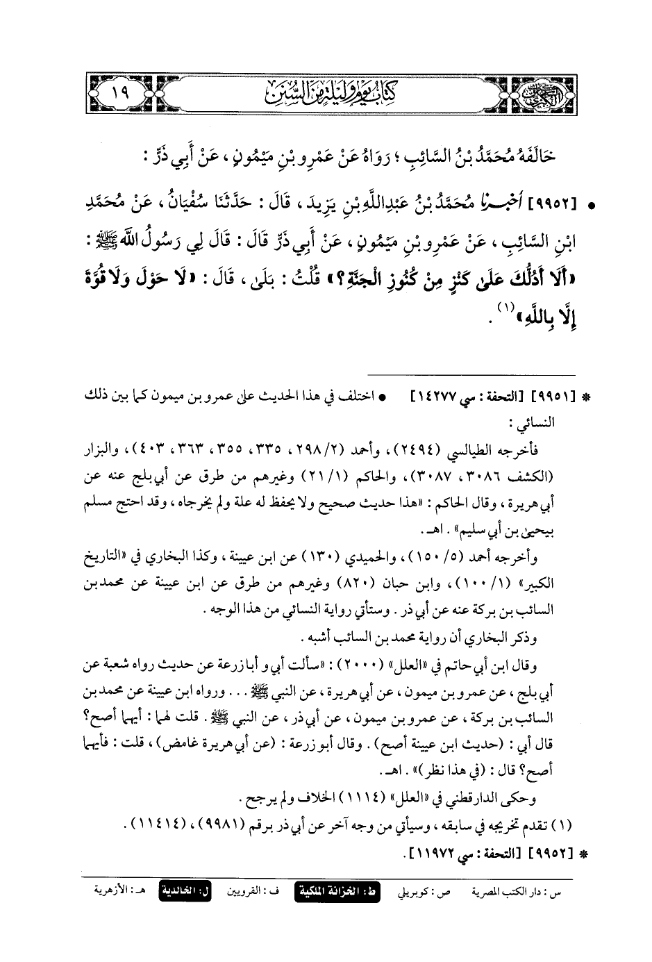 9951- أَخبَرني إِبرَاهِيمُ بنُ الحَسَنِ، قَالَ: حَدثنا حَجَّاجٌ، قَالَ: أَخبَرني شُعبَةُ، عَن أَبي بَلْجٍ، عَن عَمْرِو بنِ مَيْمُونٍ، عَن أَبي هُرَيرَةَ، عَن رَسُولِ اللهِ صَلى الله عَليه وسَلم قَالَ: ألا أُعَلِّمُكَ كَلِمَةً مِنْ كَنْزٍ مِنْ تَحْتِ الجَنَّةِ؟ لا حَوْلَ وَلا قُوَّةَ إِلاَّ بِاللهِ، يَقُولُ: أَسْلَمَ عَبدِي وَاسْتَسْلَمَ.