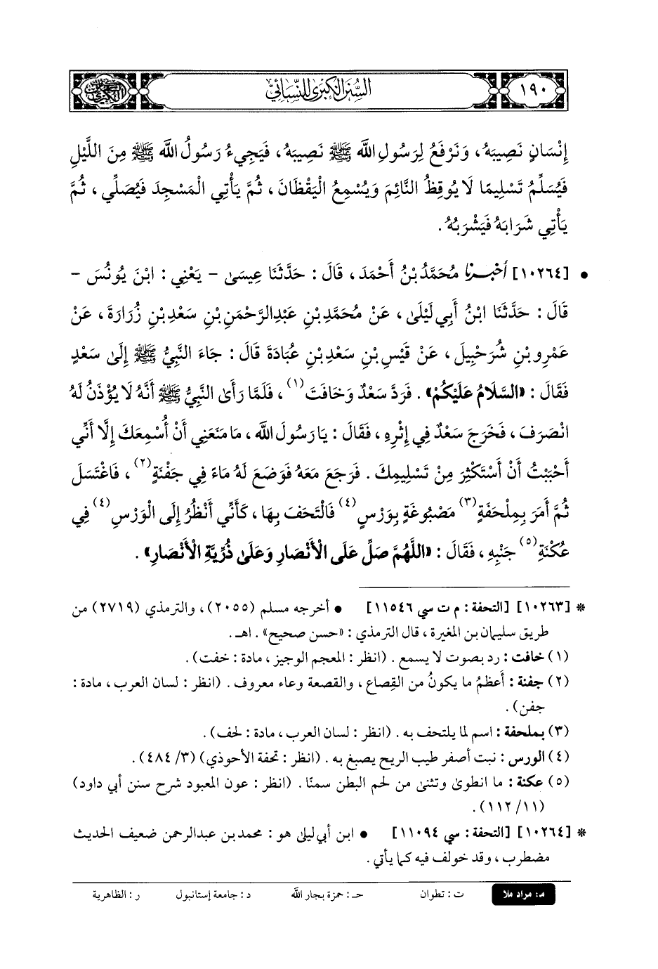 10263- أَخبَرنا مُحَمدُ بنُ حَاتِمٍ، قَالَ: أَخبَرنا حِبَّانُ، قَالَ: أَخبَرنا عَبدُ اللهِ، عَن سُلَيمَانَ بنِ المُغِيرَةِ، عَن ثَابِتٍ، عَنِ ابنِ أَبي لَيْلَى، عَنِ المِقْدَادِ بنِ الأَسْوَدِ قَالَ: أَقْبَلْتُ أَنَا وَصَاحِبٌ لِي، فَجَعَلْنَا نَعْرِضُ أَنْفُسَنَا عَلَى أَصْحَابِ رَسُولِ اللهِ صَلى الله عَليه وسَلم، وَلَيْسَ أَحَدٌ يَقْبَلُنَا، فَأَتَيْنَا النَّبيَّ صَلى الله عَليه وسَلم، فَأَتَى بِنَا أَهْلَهُ، فَإِذَا ثَنيةُ (1) أَعْنُزٍ، فَقَالَ النَّبيُّ صَلى الله عَليه وسَلم: احْتَلِبُوا هَذَا اللَّبَنَ بَيْنَنَا، فَكُنَّا نَحْتَلِبُهُ، فَيَشْرَبُ كُلُّ إِنْسَانٍ نَصِيبَهُ، وَنَرْفَعُ لِرَسُولِ اللهِ صَلى الله عَليه وسَلم نَصِيبَهُ، فَيَجِئُ رَسُولُ اللهِ صَلى الله عَليه وسَلم مِنَ اللَّيْلِ فَيُسَلِّمُ تَسْلِيمًا لا يُوقِظُ النَّائِمَ، وَيُسْمِعُ اليَقْظَانَ، ثُمَّ يَأْتِي المَسْجِدَ فَيُصَلِّي، ثُمَّ يَأْتِي شَرَابَهُ، فَيَشْرَبُهُ