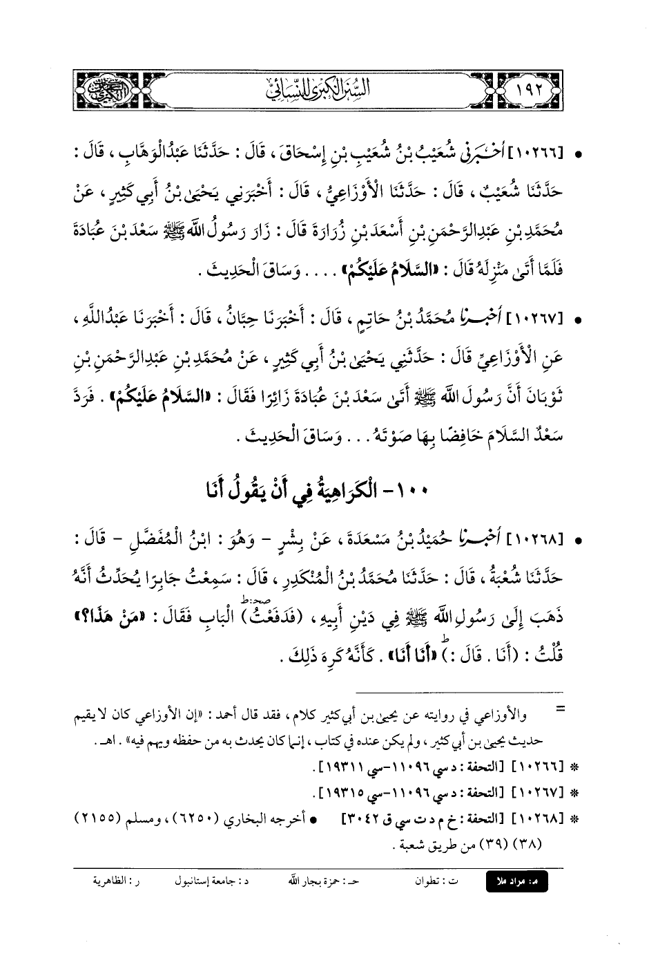 10267- أَخبَرنا مُحَمدُ بنُ حَاتِمٍ، قَالَ: أَخبَرنا حَبَّانُ، قَالَ: أَخبَرنا عَبدُ اللهِ، عَنِ الأَوْزَاعِيِّ، قَالَ: حَدَّثني يَحيَى بنُ أَبي كَثِيرٍ، عَن مُحَمدِ بنِ عَبدِ الرَّحمَنِ بنِ ثَوْبَانَ، أَنَّ رَسُولَ اللهِ صَلى الله عَليه وسَلم أَتَى سَعْدَ بْنَ عُبَادَةَ زَائِرًا، فَقَالَ: السَّلامُ عَلَيْكُمْ، فَرَدَّ سَعْدٌ السَّلامَ خَافِضًا بِهَا صَوْتَهُ ... وَسَاقَ الحَدِيثَ.