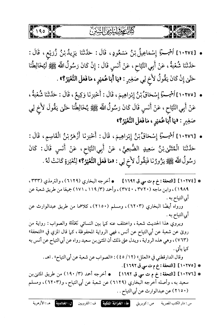 10273- أَخبَرنا عِمْرَانُ بنُ بَكَّارٍ، قَالَ: حَدثنا الحَسَنُ بنُ خُمَيْرٍ، قَالَ: حَدثنا الجَرَّاحُ بنُ مَلِيحٍ، عَن شُعبَةَ بنِ الحَجَّاجِ، عَن مُحَمدِ بنِ قَيسٍ، عَن حُمَيْدٍ الطَّوِيلِ، عَن أَنَسٍ قَالَ: كَانَ رَسُولُ اللهِ صَلى الله عَليه وسَلم قَدِ اخْتَلَطَ بِنَا أَهْلَ البَيْتِ، حَتَّى إِنْ كَانَ يَقُولُ لأَخٍ لِي هُوَ أَصْغَرُ مِنِّي: يَا أَبَا عُمَيْرٍ، مَا فَعَلَ النُّغَيْرُ؟.