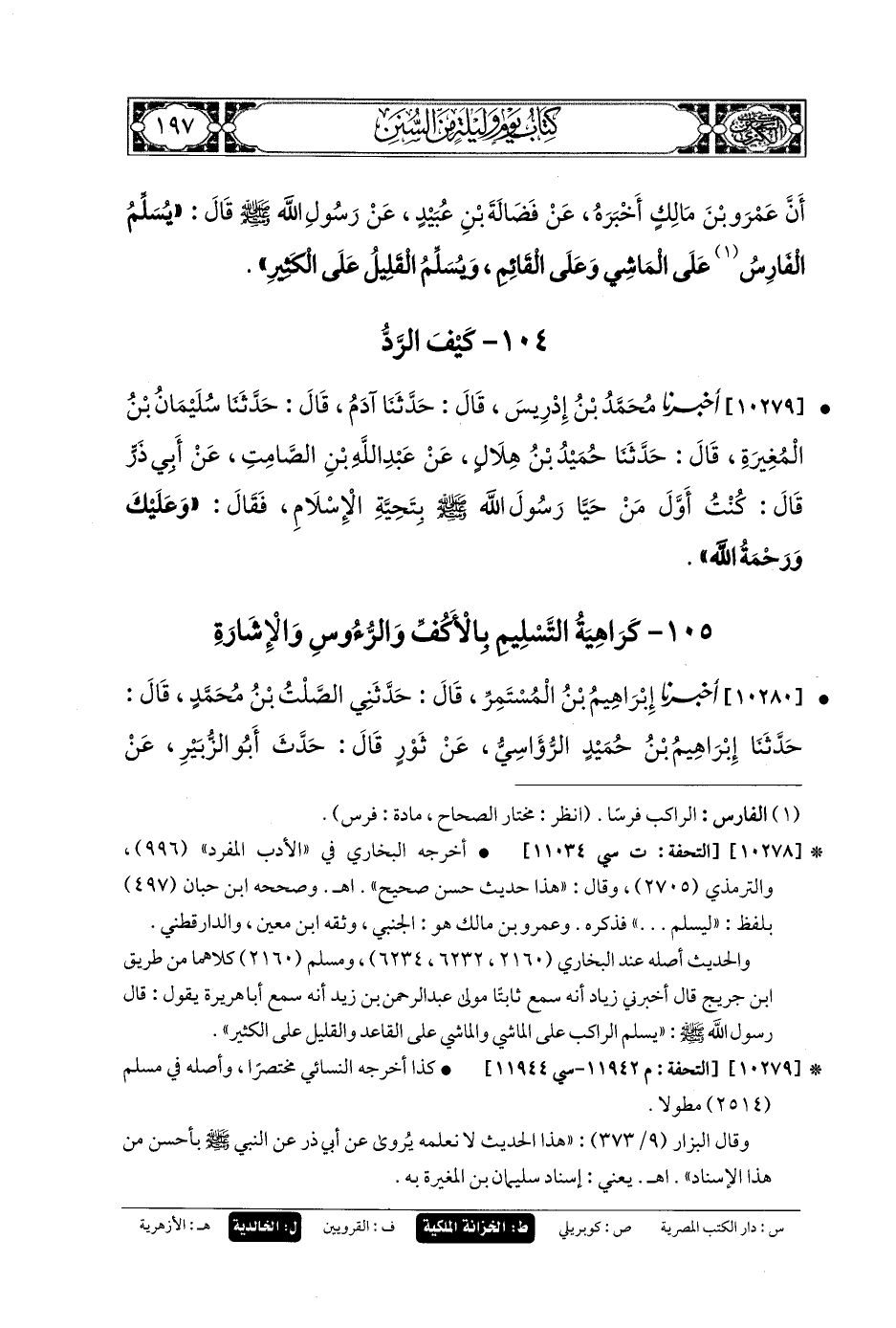 10278- أَخبَرنا وَهْبُ بنُ بَيَانٍ، قَالَ: حَدثنا ابنُ وَهْبٍ، قَالَ: حَدَّثني أَبو هَانِئٍ، أَنَّ عَمْرَو بْنَ مَالِكٍ أَخبَرَهُ، عَن فَضَالَّةَ بنِ عُبَيدٍ، عَن رَسُولِ اللهِ صَلى الله عَليه وسَلم قَالَ: يُسَلِّمُ الفَارِسُ عَلَى المَاشِي، وَعَلَى القَائِمِ، وَيُسَلِّمُ القَلِيلُ عَلَى الكَثِيرِ.