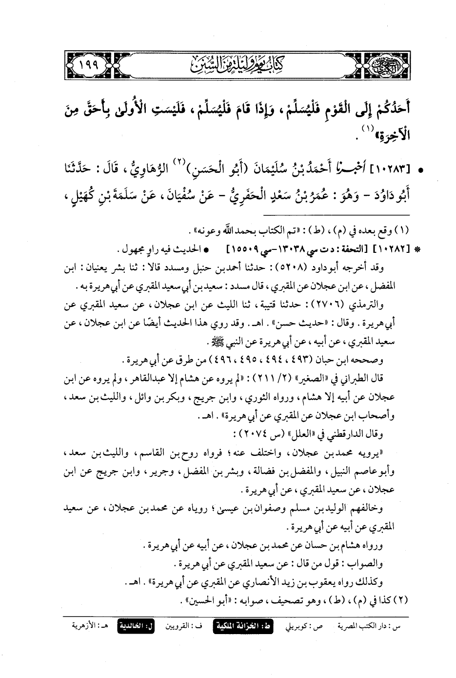 10282- أَخبَرنا أَحْمَدُ بنُ سُلَيمَانَ، وَعَبدُ الرَّحمَنِ بنُ مُحَمدِ بنِ سَلاَّمٍ، قَالا: حَدثنا يَزِيدُ، قَالَ: أَخبَرنا هِشَامٌ، عَن مُحَمدٍ، قَالَ عَبدُ الرَّحمَنِ: لَيْسَ ابنَ سِيرِينَ، عَن رَجُلٍ، عَن أَبي هُرَيرَةَ قَالَ: قَالَ رَسُولُ اللهِ صَلى الله عَليه وسَلم: إِذَا جَاءَ أَحَدُكُمْ إِلَى القَوْمِ فَلْيُسَلِّمْ، وَإِذَا قَامَ فَلْيُسَلِّمْ، فَلَيْسَتِ الأُولَى بِأَحَقَّ مِنَ الآخِرَةِ.