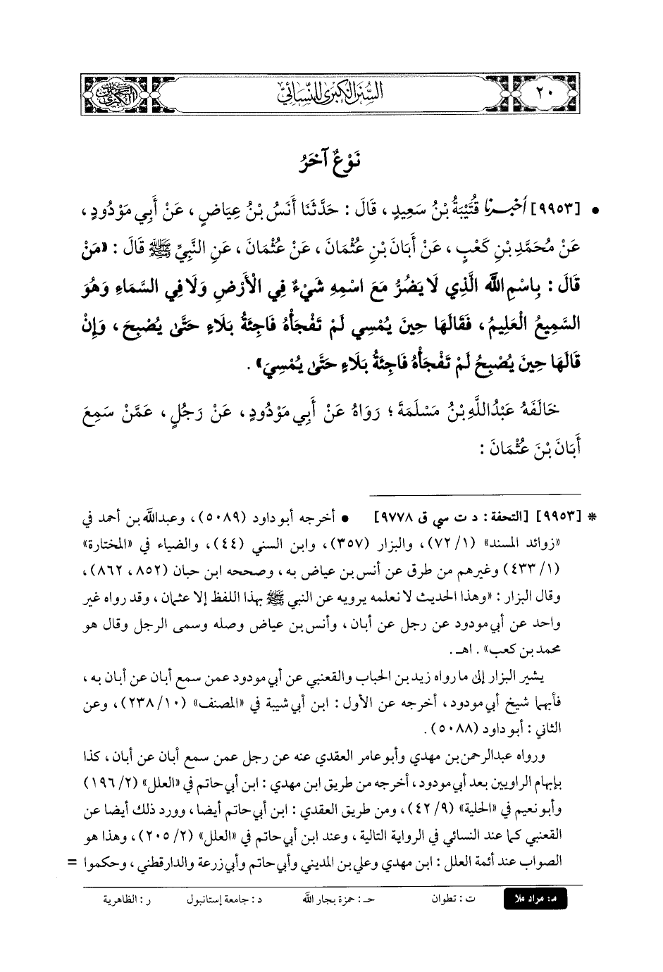 9952- أَخبَرنا مُحَمدُ بنُ عَبدِ اللهِ بنِ يَزِيدَ، قَالَ: حَدثنا سُفيانُ، عَن مُحَمدِ بنِ السَّائِبِ، عَن عَمْرِو بنِ مَيْمُونٍ، عَن أَبي ذَرٍّ قَالَ: قَالَ: لِي رَسُولُ اللهِ صَلى الله عَليه وسَلم: ألا أَدُلُّكَ عَلَى كَنْزٍ مِنْ كُنُوزِ الجَنَّةِ؟ قُلْتُ: بَلَى، قَالَ: لا حَوْلَ وَلا قُوَّةَ إِلاَّ بِاللَّهِ.