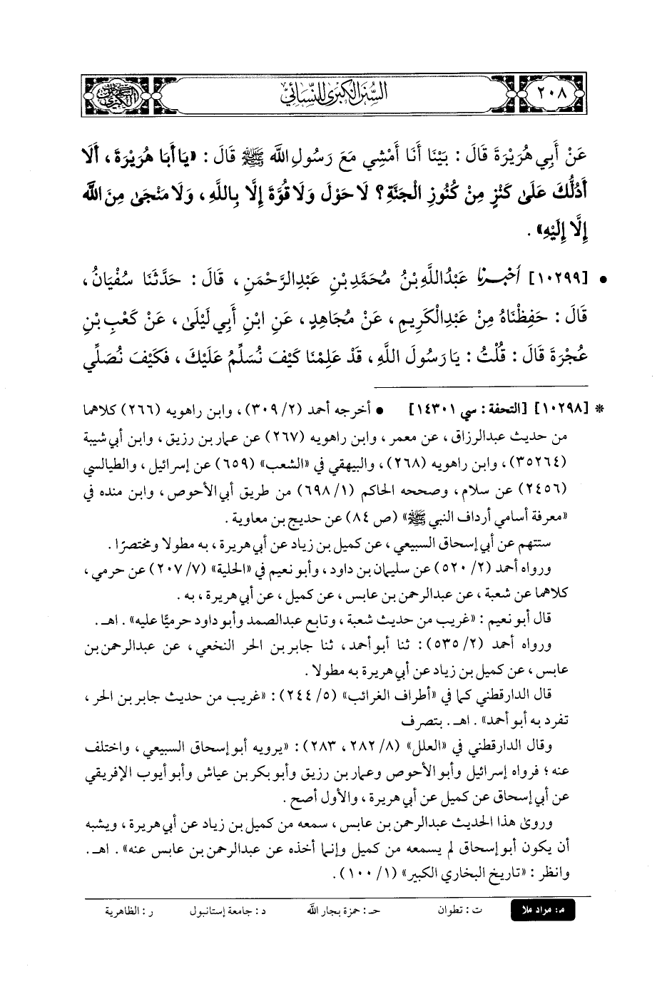 10298- أَخبَرنا القَاسِمُ بنُ زَكَرِيَّا بنِ دِينَارٍ، وَأَحْمَدُ بنُ سُلَيمَانَ، قَالا: حَدثنا عُبَيدُ اللهِ بنُ مُوسَى، عَن إِسرَائِيلَ، عَن أَبي إِسحَاقَ، عَن كُمَيْلِ بنِ زِيَادٍ النَّخَعِيُّ، عَن أَبي هُرَيرَةَ قَالَ: بَيْنَا أَنَا أَمْشِي مَعَ رَسُولِ اللهِ صَلى الله عَليه وسَلم قَالَ: يَا أَبَا هُرَيرَةَ، ألا أَدُلُّكَ عَلَى كَنْزٍ مِنْ كُنُوزِ الجَنَّةِ؟ لا حَوْلَ وَلا قُوَّةَ إِلاَّ بِاللهِ، وَلا مَنْجَى مِنَ اللهِ إِلاَّ إِلَيْهِ.