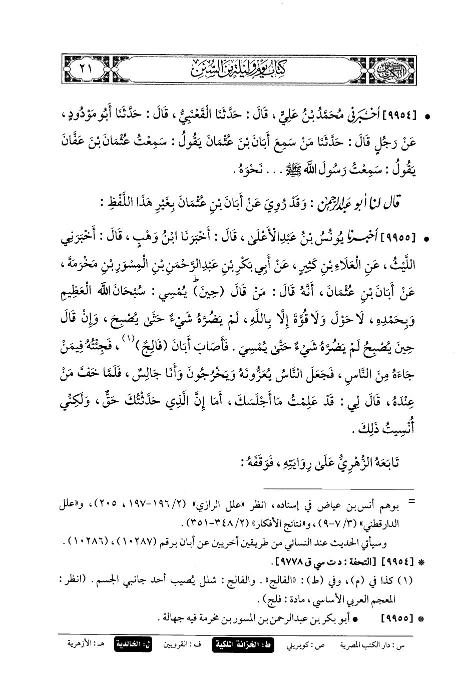 9954- أَخبَرني مُحَمدُ بنُ عَليٍّ، قَالَ: حَدثنا القَعْنَبِيُّ، قَالَ: حَدثنا أَبو مَوْدُودٍ، عَن رَجُلٍ قَالَ: حَدثنا مَنْ سَمِعَ أَبَانَ بْنَ عُثْمَانَ يَقُولُ: سَمِعْتُ عُثْمَانَ بْنَ عَفَّانَ يَقُولُ: سَمِعْتُ رَسُولَ اللهِ صَلى الله عَليه وسَلم ... نَحْوَهُ.