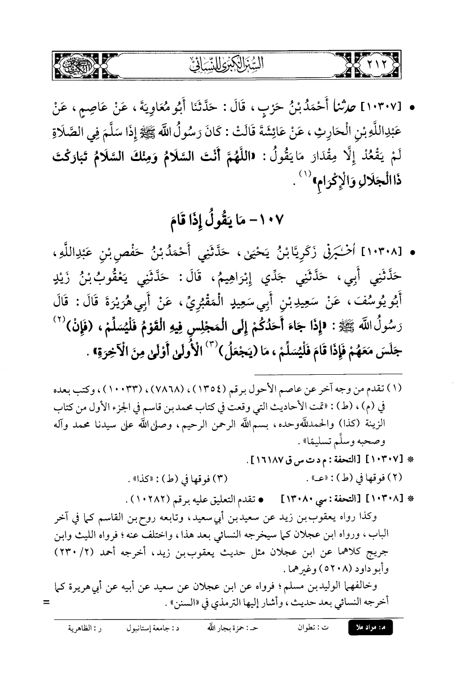 10307- حَدثنا أَحْمَدُ بنُ حَرْبٍ، قَالَ: حَدثنا أَبو مُعاويَةَ، عَن عَاصِمٍ، عَن عَبدِ اللهِ بنِ الحَارِثِ، عَن عَائِشَةَ، قَالَتْ: كَانَ رَسُولُ اللهِ صَلى الله عَليه وسَلم إِذَا سَلَّمَ فِي الصَّلاةِ لَمْ يَقْعُدْ إِلاَّ مِقْدَارَ مَا يَقُولُ: اللهُمَّ أَنْتَ السَّلامُ وَمِنْكَ السَّلامُ، تَبَارَكْتَ ذَا الجِلالِ وَالإِكْرَامِ.