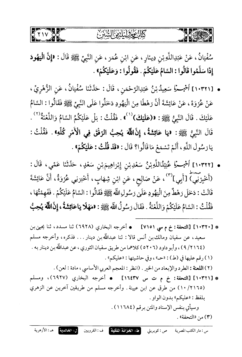 10321- أَخبَرنا سَعِيدُ بنُ عَبدِ الرَّحمَنِ، قَالَ: حَدثنا سُفيانُ، عَنِ الزُّهْرِيِّ، عَن عُرْوَةَ، عَن عَائِشَةَ، أَنَّ رَهْطًا مِنَ اليَهُودِ دَخَلُوا عَلَى النَّبيِّ صَلى الله عَليه وسَلم فَقَالُوا: السَّامُ عَلَيْكَ، قَالَ النَّبيُّ صَلى الله عَليه وسَلم: عَلَيْكُمْ (1)، فَقُلْتُ: بَلْ عَلَيْكُمُ السَّامُ وَاللَّعْنَةُ، قَالَ النَّبيُّ صَلى الله عَليه وسَلم: يَا عَائِشَةُ، إِنَّ اللهَ يُحِبُّ الرِّفْقَ فِي الأَمْرِ كُلِّهِ، فَقُلْتُ: يَا رَسُولَ اللهِ، أَلَمْ تَسْمَعْ مَا قَالُوا؟ قَالَ: قَدْ قُلْتُ: عَلَيْكُمْ.